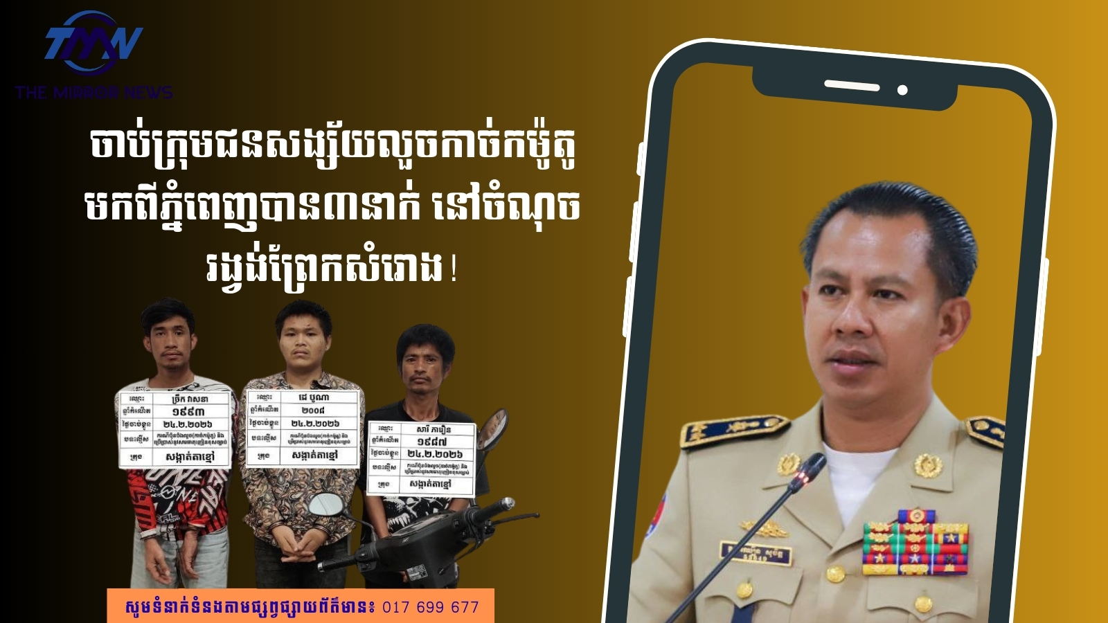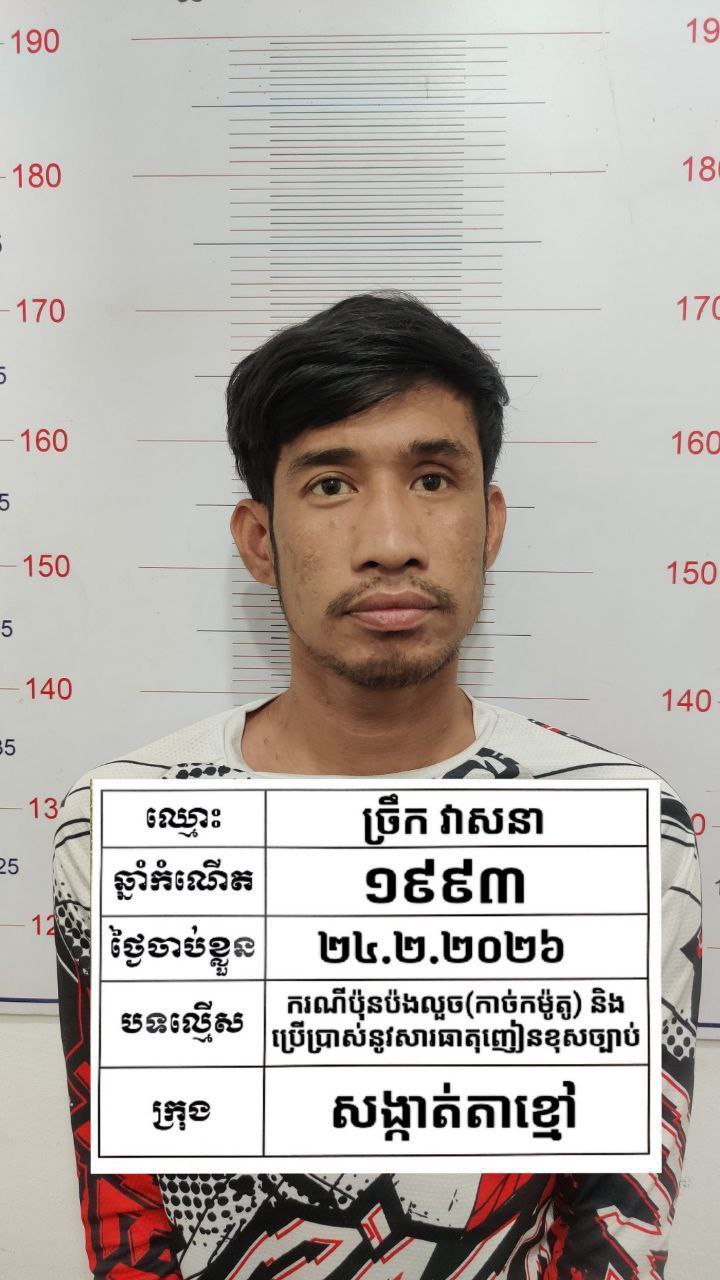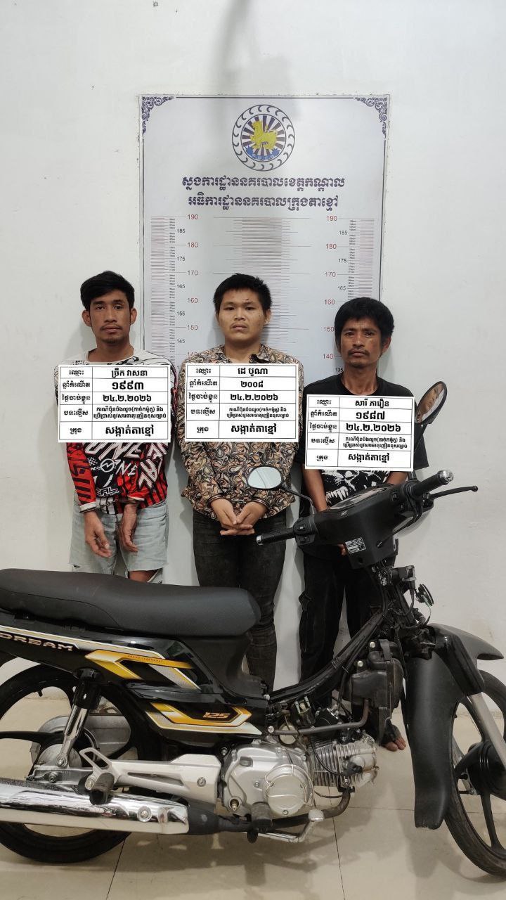 (កណ្ដាល)៖ ដោយទទួលបានបទបញ្ជាយ៉ាងម៉ឺងម៉ាត់ពីលោកឧត្ដមសេនីយ៍ទោ​ ឈឿន សុចិត្ត ស្នងការនគរបាលខេត្តកណ្ដាល នៅវេលាម៉ោង ២៖៣០នាទីរសៀល ថ្ងៃអង្គា ទី២៤ ខែកុម្ភៈ ឆ្នាំ ២០២៦ លោកវរសេនីយ៍ឯក យី វណ្ណដា អធិការនគរបាលក្រុងតាខ្មៅបានដឹកនាំកម្លាំងចុះបង្ក្រាបនិងឃាត់ខ្លួនបានក្រុមជនសង្ស័យប៉ុនប៉ងលួចកាច់កម៉ូតូមកពីរាជធានីភ្នំពេញបាន៣នាក់ ដែលមានផ្ទុកនូវសារធាតុញៀនក្នុងទឹកនោម នៅចំណុចរង្វង់មូលព្រែកសំរោង ភូមិព្រែកសំរោង សង្កាត់តាខ្មៅ ក្រុងតាខ្មៅ ខេត្តកណ្តាល។ នេះបើតាមប្រភពព័ត៌មានដែលអង្គភាព The Mirror News ទទួលបាននៅរសៀលថ្ងៃទី២៥ ខែកុម្ភៈ ឆ្នាំ២០២៦នេះ។