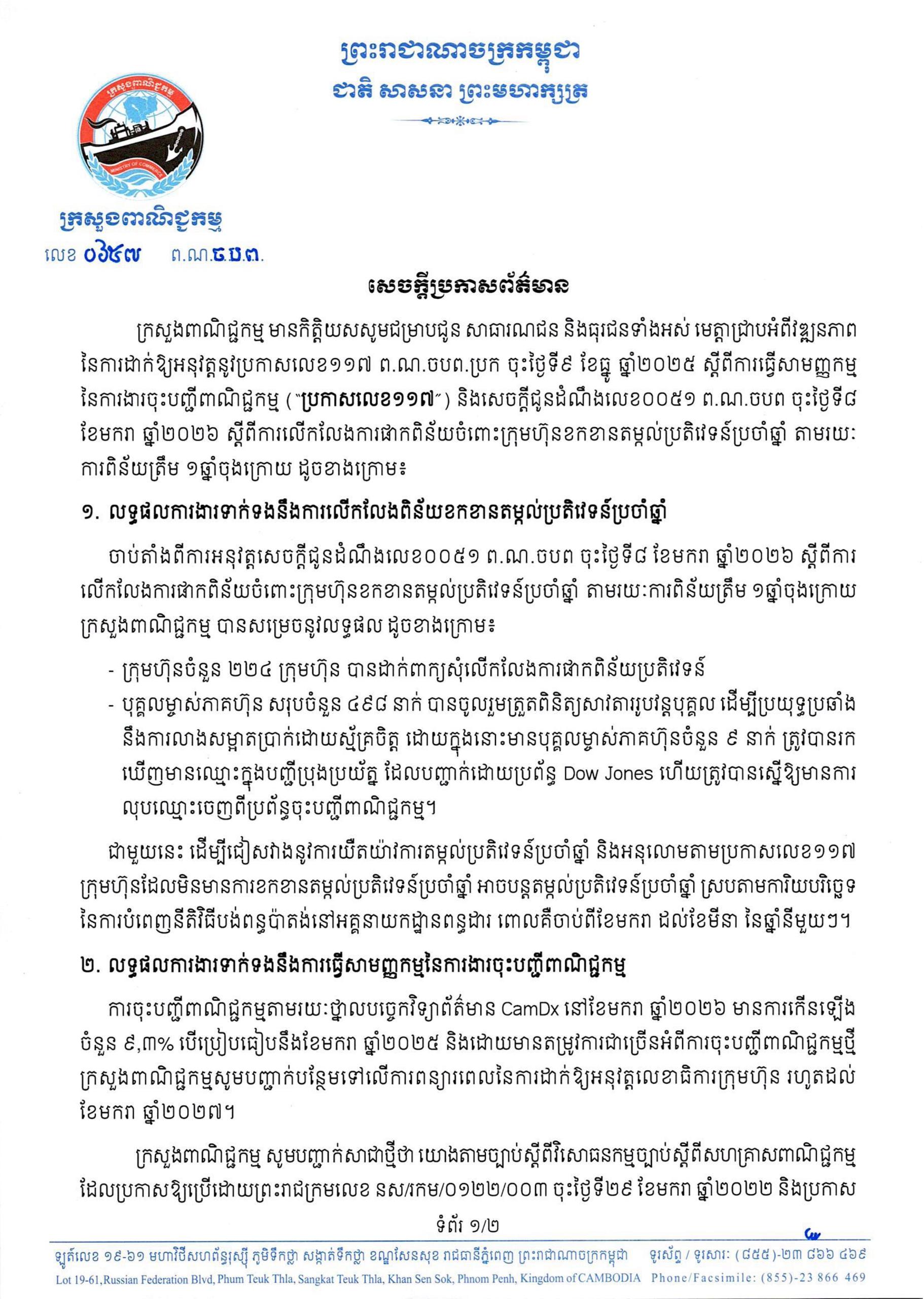 (ភ្នំពេញ)៖ ក្រសួងពាណិជ្ជកម្មបានបង្ហាញអំពីវឌ្ឍនភាព នៃការដាក់ឱ្យអនុវត្តនូវប្រកាសលេខ១១៧ ព.ណ.ចបព.ប្រក ចុះថ្ងៃទី៩ ខែធ្នូ ឆ្នាំ២០២៥ ស្តីពីការធ្វើសាមញ្ញកម្ម នៃការងារចុះបញ្ជីពាណិជ្ជកម្ម (“ប្រកាសលេខ១១៧”) និងសេចក្តីជូនដំណឹងលេខ០០៥១ ព.ណ.ចបព ចុះថ្ងៃទី៨ ខែមករា ឆ្នាំ២០២៦ ស្តីពីការលើកលែងការផាកពិន័យចំពោះក្រុមហ៊ុនខកខានតម្កល់ប្រតិវេទន៍ប្រចាំឆ្នាំ តាមរយៈ ការពិន័យត្រឹម ១ឆ្នាំចុងក្រោយ ដូចខាងក្រោម៖