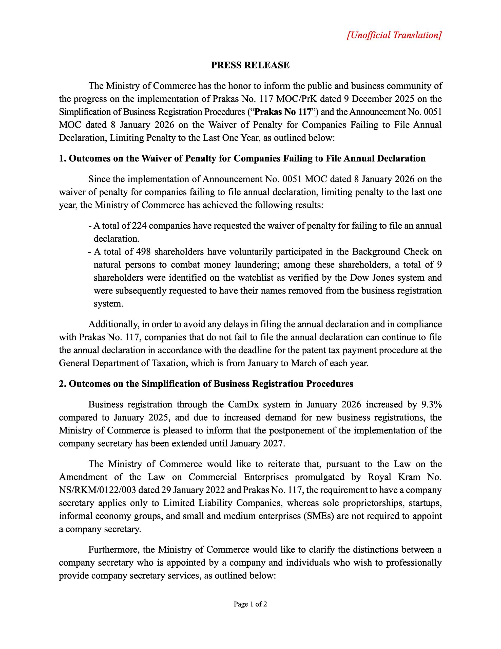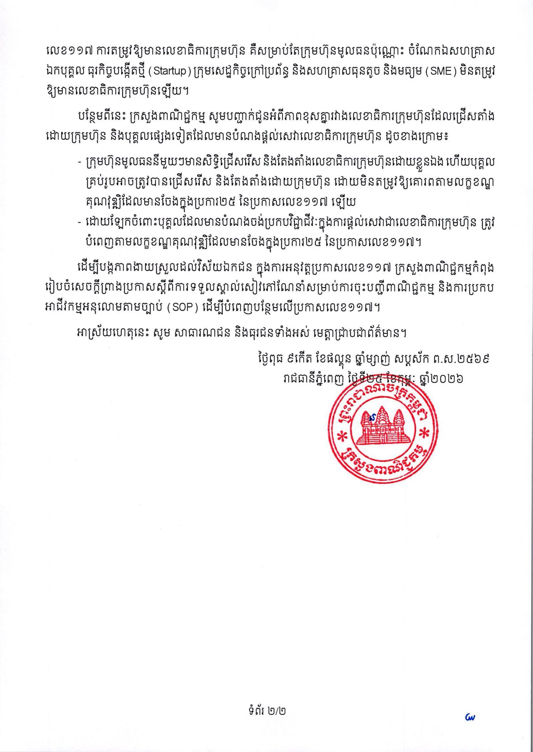 *២. លទ្ធផលការងារទាក់ទងនឹងការធ្វើសាមញ្ញកម្មនៃការងារចុះបញ្ជីពាណិជ្ជកម្មការចុះបញ្ជីពាណិជ្ជកម្មតាមរយៈថ្នាលបច្ចេកវិទ្យាព័ត៌មាន CamDx នៅខែមករា ឆ្នាំ២០២៦ មានការកើនឡើង ចំនួន ៩,៣% បើប្រៀបធៀបនឹងខែមករា ឆ្នាំ២០២៥ និងដោយមានតម្រូវការជាច្រើនអំពីការចុះបញ្ជីពាណិជ្ជកម្មថ្មី ក្រសួងពាណិជ្ជកម្មសូមបញ្ជាក់បន្ថែមទៅលើការពន្យារពេលនៃការដាក់ឱ្យអនុវត្តលេខាធិការក្រុមហ៊ុន រហូតដល់ ខែមករា ឆ្នាំ២០២៧។ក្រសួងពាណិជ្ជកម្ម សូមបញ្ជាក់សាជាថ្មីថា យោងតាមច្បាប់ស្តីពីវិសោធនកម្មច្បាប់ស្តីពីសហគ្រាសពាណិជ្ជកម្ម ដែលប្រកាសឱ្យប្រើដោយព្រះរាជក្រមលេខ នស/រកម/០១២២/០០៣ ចុះថ្ងៃទី២៩ ខែមករា ឆ្នាំ២០២២ និងប្រកាសលេខ១១៧ ការតម្រូវឱ្យមានលេខាធិការក្រុមហ៊ុន គឺសម្រាប់តែក្រុមហ៊ុនមូលធនប៉ុណ្ណោះ ចំណែកឯសហគ្រាស ឯកបុគ្គល ធុរកិច្ចបង្កើតថ្មី (Startup) ក្រុមសេដ្ឋកិច្ចក្រៅប្រព័ន្ធ និងសហគ្រាសធុនតូច និងមធ្យម (SME) មិនតម្រូវ ឱ្យមានលេខាធិការក្រុមហ៊ុនឡើយ។បន្ថែមពីនេះ ក្រសួងពាណិជ្ជកម្ម សូមបញ្ជាក់ជូនអំពីភាពខុសគ្នារវាងលេខាធិការក្រុមហ៊ុនដែលជ្រើសតាំង ដោយក្រុមហ៊ុន និងបុគ្គលផ្សេងទៀតដែលមានបំណងផ្តល់សេវាលេខាធិការក្រុមហ៊ុន ដូចខាងក្រោម៖ *ក្រុមហ៊ុនមូលធននីមួយៗមានសិទ្ធិជ្រើសរើស និងតែងតាំងលេខាធិការក្រុមហ៊ុនដោយខ្លួនឯង ហើយបុគ្គល គ្រប់រូបអាចត្រូវបានជ្រើសរើស និងតែងតាំងដោយក្រុមហ៊ុន ដោយមិនតម្រូវឱ្យគោរពតាមលក្ខខណ្ឌ គុណវុឌ្ឍដែលមានចែងក្នុងប្រការ២៥ នៃប្រកាសលេខ១១៧ ឡើយ។ *ដោយឡែកចំពោះបុគ្គលដែលមានបំណងចង់ប្រកបវិជ្ជាជីវៈក្នុងការផ្តល់សេវាជាលេខាធិការក្រុមហ៊ុន ត្រូវ បំពេញតាមលក្ខខណ្ឌគុណវុឌ្ឍដែលមានចែងក្នុងប្រការ២៥ នៃប្រកាសលេខ១១៧។