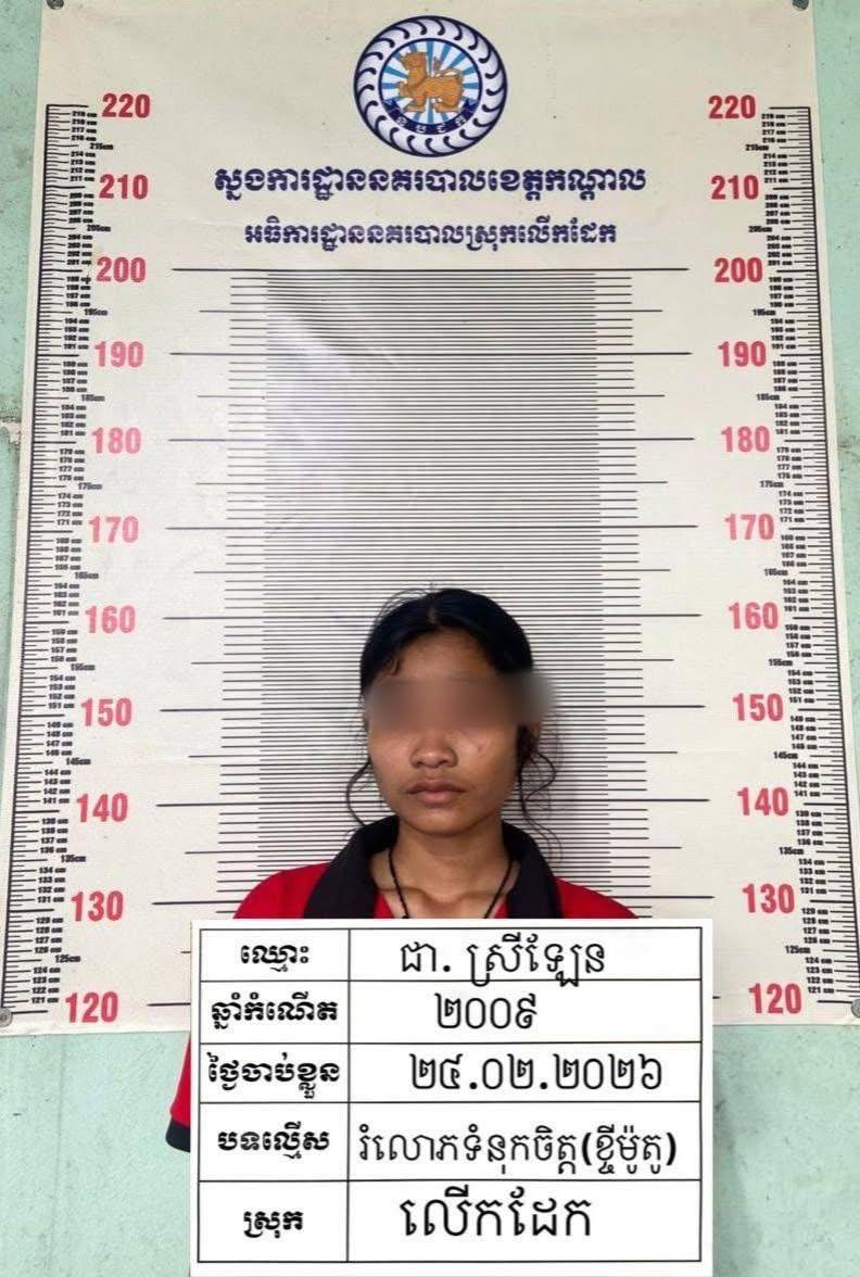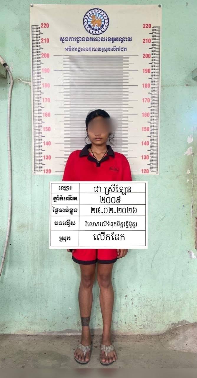 (កណ្ដាល)៖ ជនសង្ស័យម្នាក់ក្នុងចំណោមបក្ខពួក៥នាក់ត្រូវបានកម្លាំងនគរបាលស្រុកលើកដែកខេត្តកណ្ដាលចាប់ឃាត់ខ្លួនពាក់ព័ន្ធពីករណី រំលោភលើទំនុកចិត្តកាលពីវេលាម៉ោង ១៦៖៣០នាទី ថ្ងៃទី២៣ ខែកុម្ភៈ ឆ្នាំ២០២៦ នៅចំណុផ្ទះសំណាក់មានកោះមាស ស្ថិតនៅភូមិអំពិលទឹក ឃុំកំពង់ភ្នំ ស្រុកលេីកដែក ខេត្តកណ្តាល។ នេះបើតាមប្រភពដែលអង្គភាពព័ត៌មាន The Mirror News ទទួលបាននៅថ្ងៃទី២៦ ខែកុម្ភៈ ឆ្នាំ២០២៦នេះ។