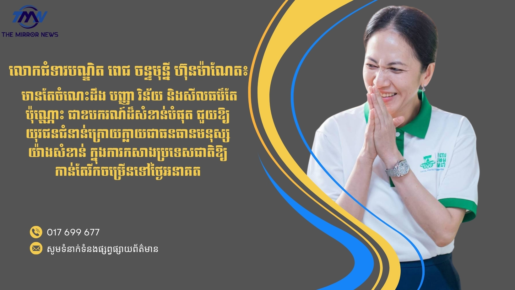 លោកជំទាវបណ្ឌិត ពេជ ចន្ទមុន្នី ហ៊ុនម៉ាណែត៖ មានតែចំណេះដឹង បញ្ញា វិន័យ និងសីលធម៌តែប៉ុណ្ណោះ ជាឧបករណ៍ដ៏សំខាន់បំផុត ជួយឱ្យយុវជនជំនាន់ក្រោយក្លាយជាធនធានមនុស្សយ៉ាងសំខាន់ ក្នុងការកសាងប្រទេសជាតិឱ្យកាន់តែរីកចម្រើនទៅថ្ងៃអនាគត