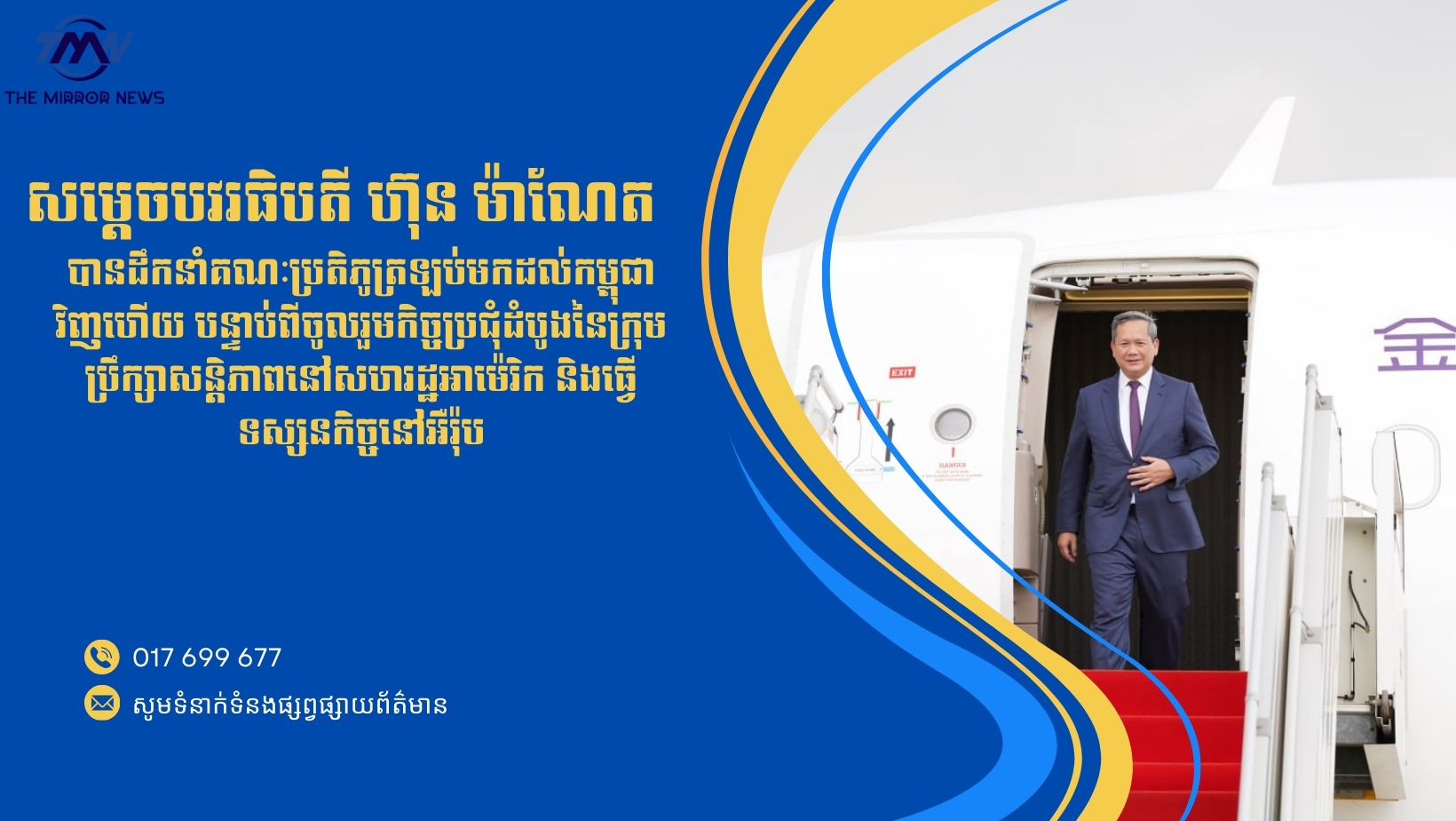 សម្តេចបវរធិបតី ហ៊ុន ម៉ាណែត បានដឹកនាំគណៈប្រតិភូត្រឡប់មកដល់កម្ពុជាវិញហើយ បន្ទាប់ពីចូលរួមកិច្ចប្រជុំដំបូងនៃក្រុមប្រឹក្សាសន្តិភាពនៅសហរដ្ឋអាម៉េរិក និងធ្វើទស្សនកិច្ចនៅអឺរ៉ុប