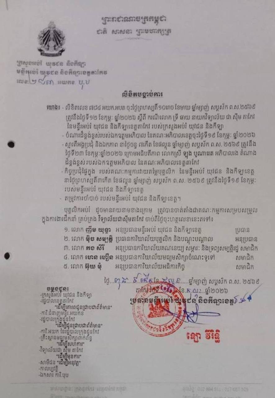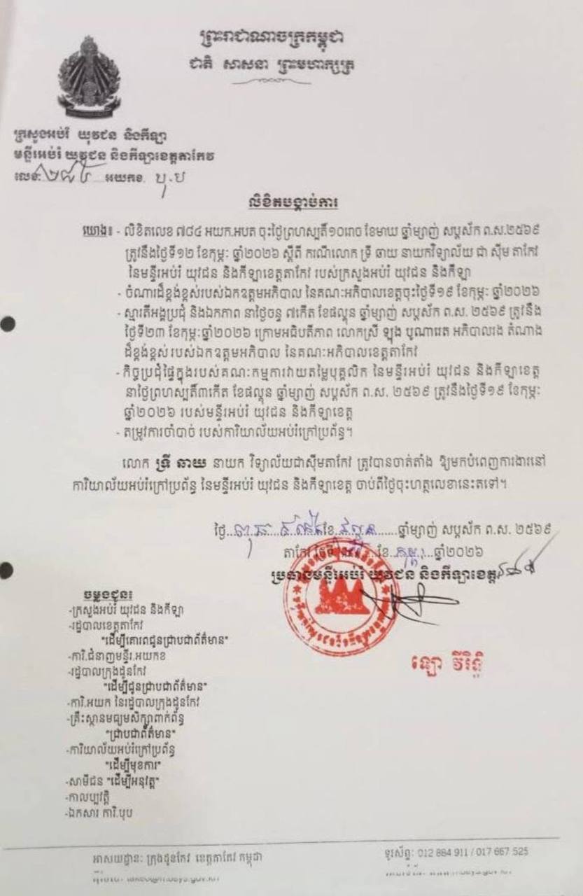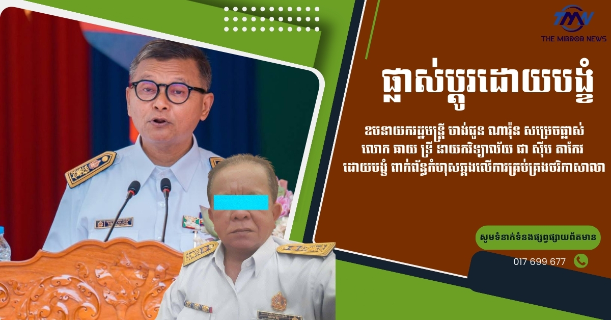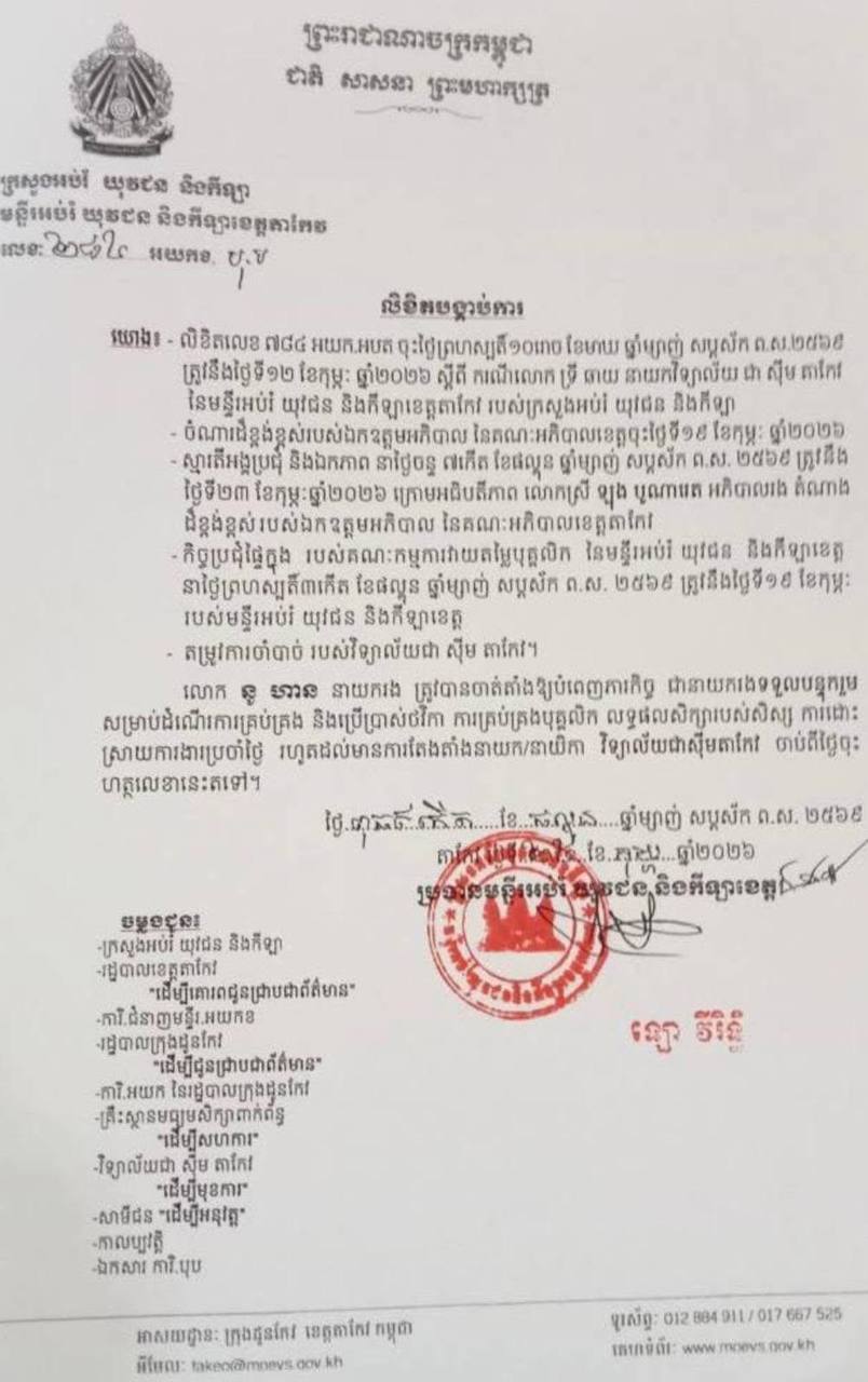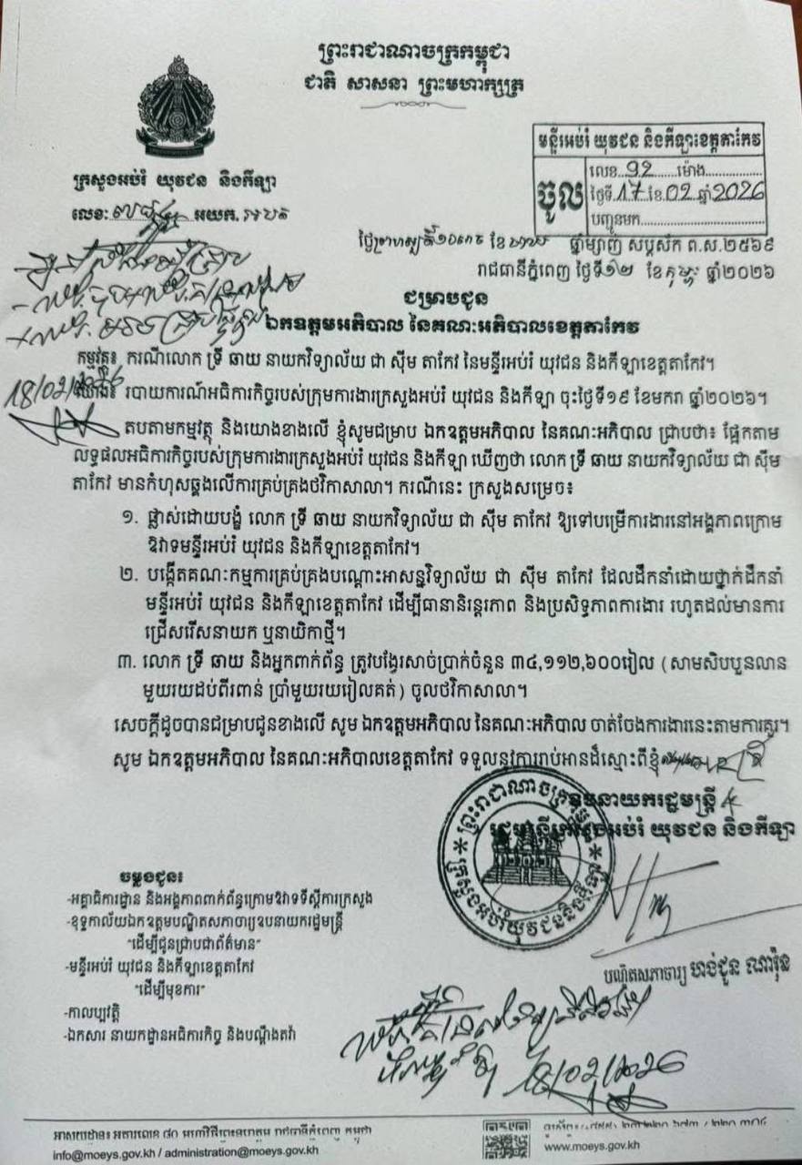 (តាកែវ)៖ លោកឧបនាយករដ្ឋមន្រ្តី ហង់ជួន ណារ៉ុន រដ្ឋមន្ត្រីក្រសួងអប់រំ យុវជន និងកីឡាបានសម្រេចផ្លាស់លោក ទ្រី ឆាយ នាយកវិទ្យាល័យ ជា ស៊ីម តាកែវ ដោយបង្ខំឱ្យទៅបម្រើការងារនៅអង្គភាពក្រោម ឱវាទមន្ទីរអប់រំ យុវជន និងកីឡាខេត្តតាកែវពាក់ព័ន្ធកំហុសឆ្គងលើការគ្រប់គ្រងថវិកាសាលា។ នេះបើតាមសេចក្ដីសម្រេចរបស់លោកឧបនាយករដ្ឋមន្រ្តី ហង់ជួន ណារ៉ុន រដ្ឋមន្ត្រីក្រសួងអប់រំ យុវជន និងកីឡាដែលអង្គភា The Mirror News ទទួលបាននៅព្រឹកថ្ងៃទី២៧ ខែកុម្ភៈ ឆ្នាំ២០២៦នេះ។