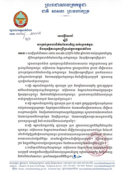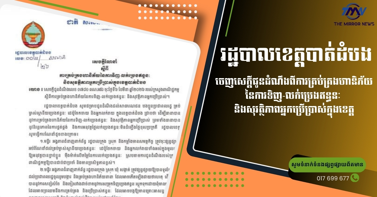 (បាត់ដំបង)៖ រដ្ឋបាលខេត្តបាត់ដំបងបានជូនដំណឹងដល់សាធារណជន បងប្អូនប្រជាពលរដ្ឋ គ្រប់ ម្ចាស់ស្ថានីយប្រេងឥន្ធនៈ ដេប៉ូចែកចាយ និងអ្នកលក់រាយ ក្នុងខេត្តបាត់ដំបង ជ្រាបថា ដើម្បីធានាបាន នូវការគ្រប់គ្រងហានិភ័យនៃការទិញ-លក់ប្រេងឥន្ធនៈ និងសុវត្ថិភាពអ្នកប្រើប្រាស់ ព្រមទាំងធានាបាន នូវនិរន្តរភាពនៃការផ្គត់ផ្គង់ និងការអនុវត្តថ្លៃលក់ប្រេងឥន្ធនៈមិនដំឡើងថ្លៃខុសប្រក្រតី រដ្ឋបាលខេត្ត សូមធ្វើការណែនាំដូចខាងក្រោម៖