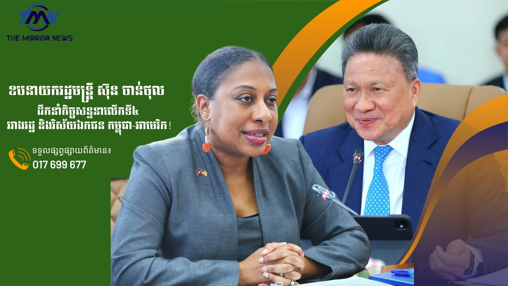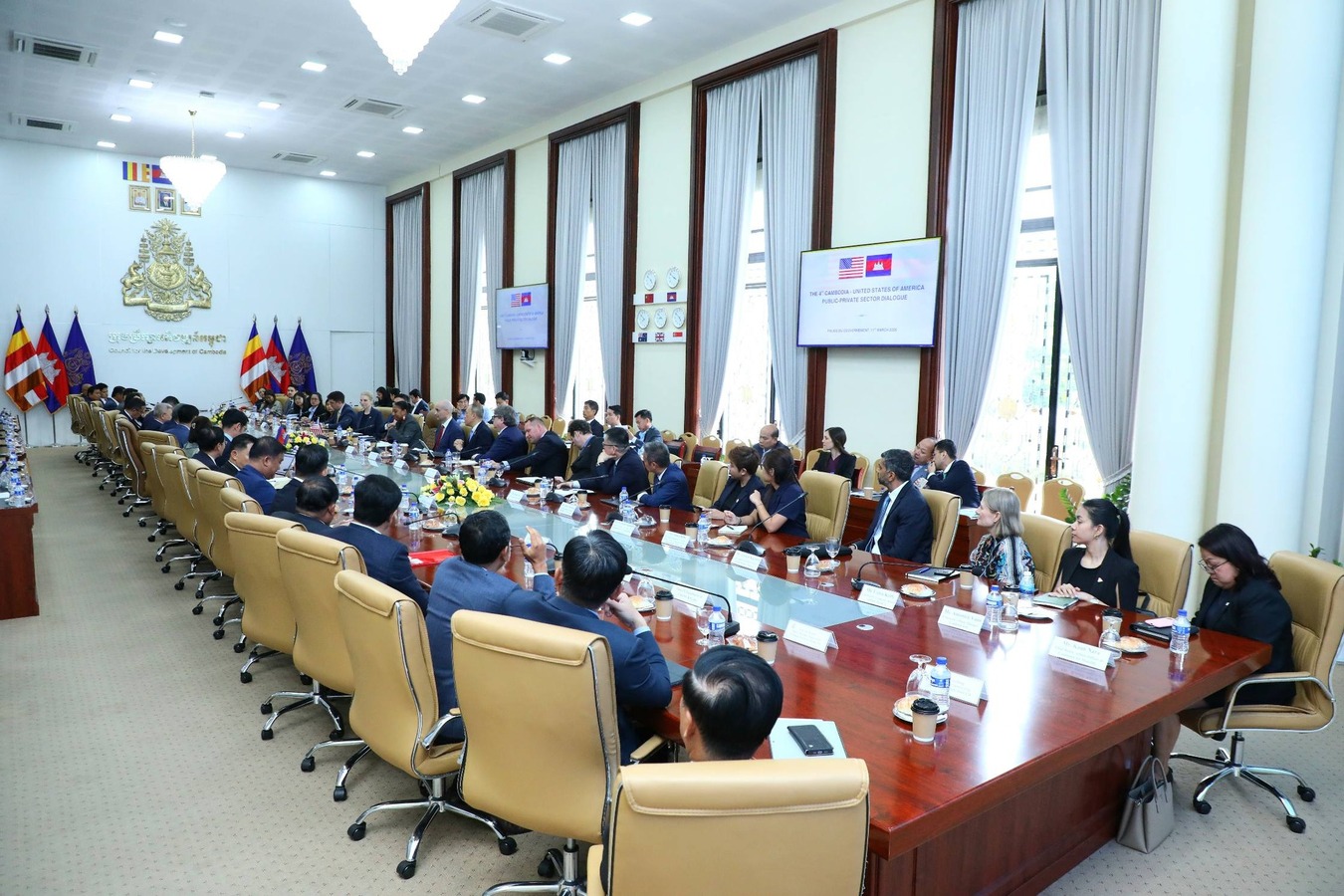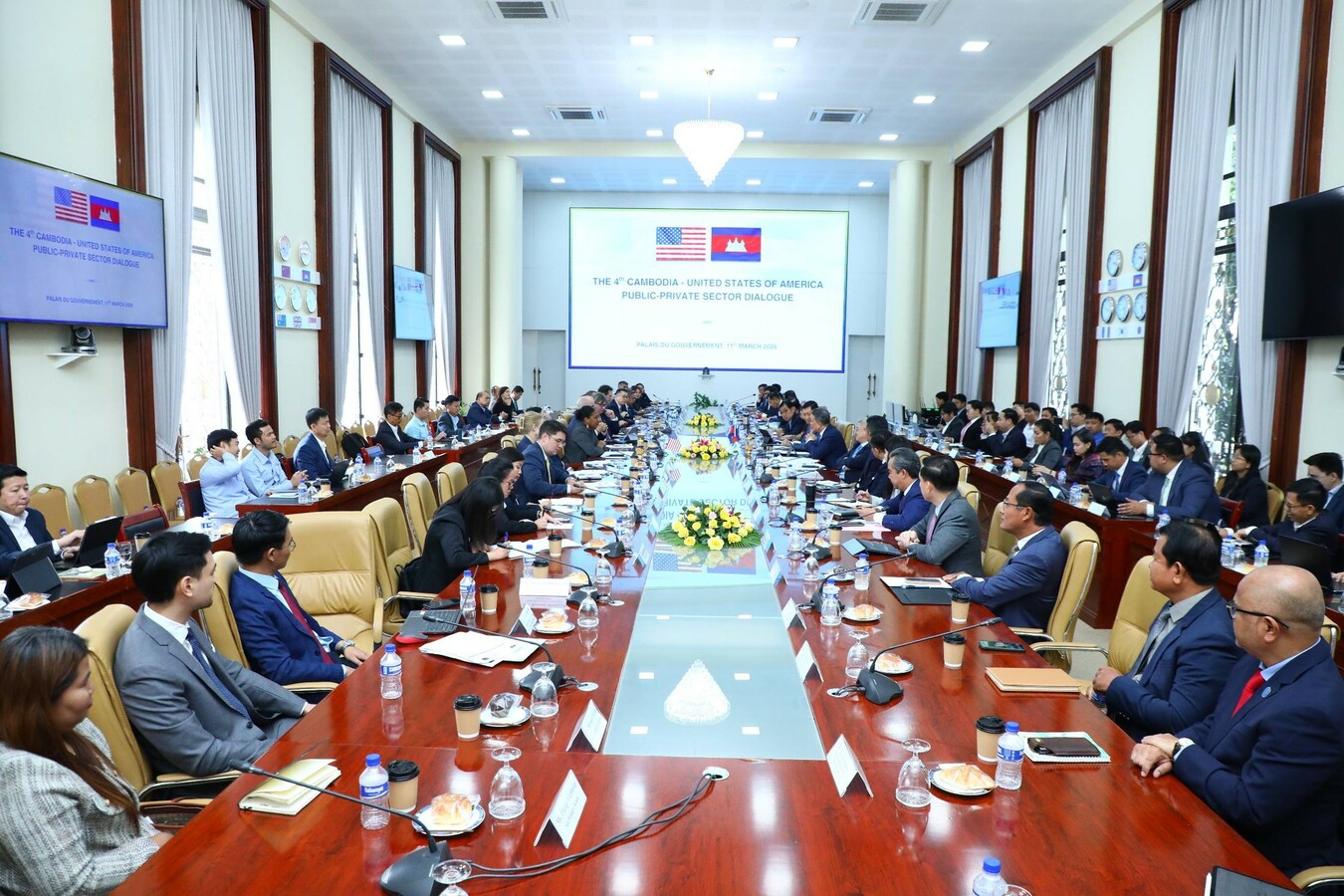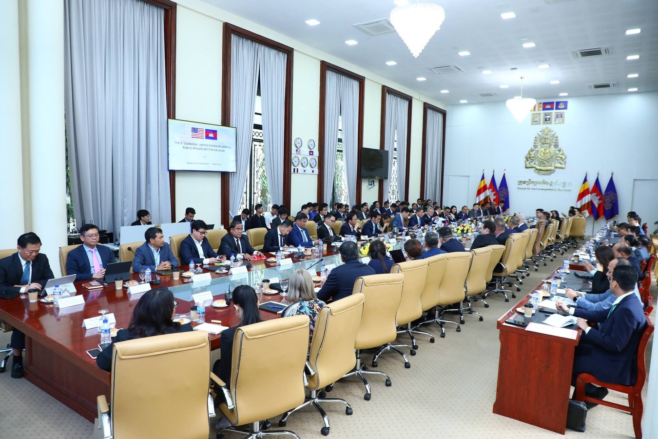 (ភ្នំពេញ)៖ នារសៀលថ្ងៃពុធ ទី១១ ខែមីនា ឆ្នាំ២០២៦, ឯកឧត្តម ស៊ុន ចាន់ថុល ឧបនាយករដ្ឋមន្រ្តី និងអនុប្រធានទី១ ក្រុមប្រឹក្សាអភិវឌ្ឍន៍កម្ពុជា បានអញ្ជើញដឹកនាំ កិច្ចសន្ទនាលើកទី៤ រវាងរដ្ឋ និងវិស័យឯកជន កម្ពុជា-សហរដ្ឋអាម៉េរិក ជាមួយលោកស្រី Bridgette L. Walker, ភារធារីស្ថានទូតសហរដ្ឋអាម៉េរិកប្រចាំកម្ពុជា។ កិច្ចសន្ទនានេះមានការចូលរួមពីឯកឧត្តម កែវ រតនៈ, រដ្ឋមន្ត្រីក្រសួងរ៉ែ និងថាមពល និងអនុប្រធានទី៣ ក្រុមប្រឹក្សាអភិវឌ្ឍន៍កម្ពុជា, ឯកឧត្តម អគ្គលេខាធិការ និង អគ្គលេខាធិការរង ក.អ.ក., លោក Casey Barnett, ប្រធានសភាពាណិជ្ជកម្មអាម៉េរិកនៅកម្ពុជា (AmCham Cambodia), ឯកឧត្តមលោកជំទាវ តំណាងក្រសួងស្ថាប័នពាក់ព័ន្ធ, តំណាង US-ABC, និងវិស័យឯកជន និងមន្ត្រីជំនាញជាច្រើន។