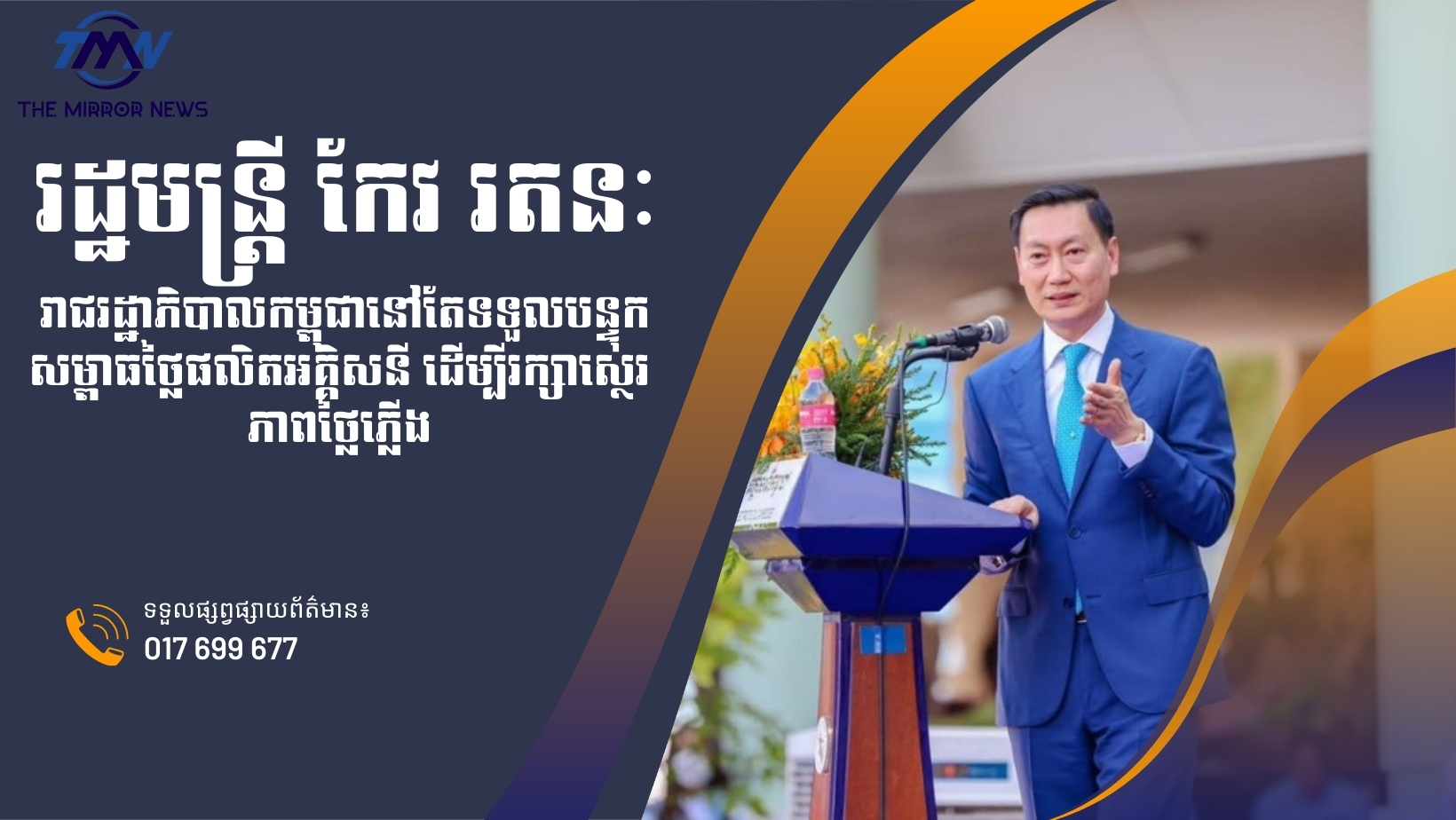 (ភ្នំពេញ)៖ ឯកឧត្តម កែវ រតនៈ រដ្ឋមន្ត្រីក្រសួងរ៉ែ និងថាមពល បានបញ្ជាក់ថា រាជរដ្ឋាភិបាលកម្ពុជា នៅតែបន្តទទួលបន្ទុកសម្ពាធនៃការកើនឡើងថ្លៃដើមផលិតអគ្គិសនី ទោះបីជាមានវិបត្តិប្រេងឥន្ធនៈកើតឡើងនៅលើទីផ្សារអន្តរជាតិ ដើម្បីធានារក្សាស្ថេរភាពថ្លៃអគ្គិសនីសម្រាប់ប្រជាពលរដ្ឋ និងវិស័យសេដ្ឋកិច្ច។