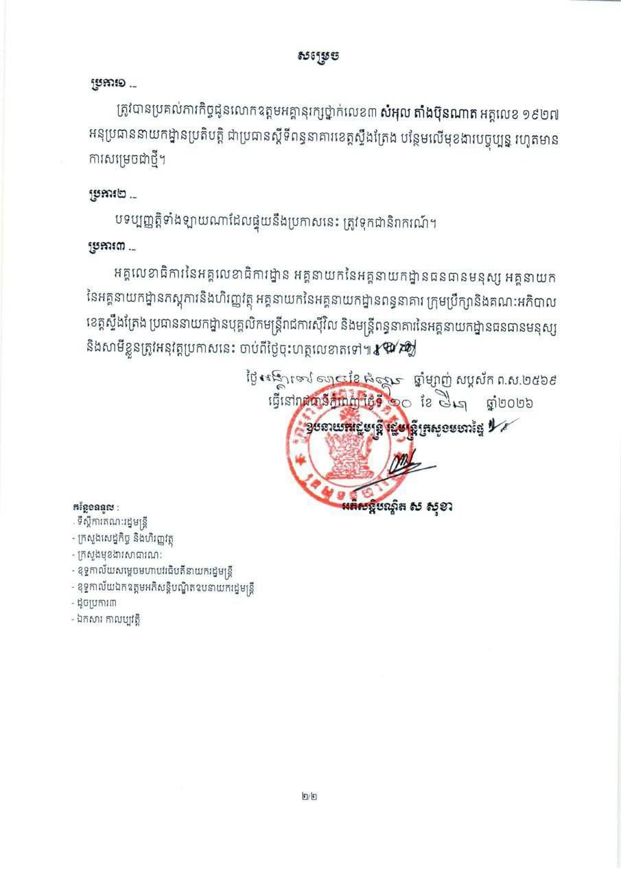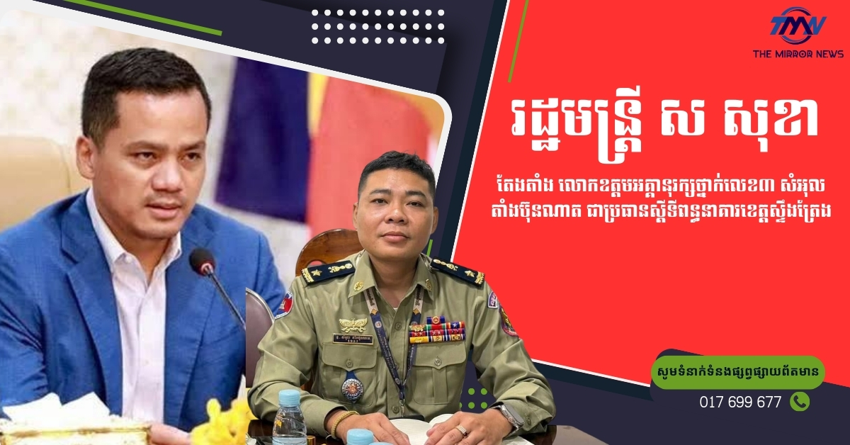 (ភ្នំពេញ)៖ ឧបនាយករដ្ឋមន្ដ្រី រដ្ឋមន្ដ្រីក្រសួងមហាផ្ទៃ លោកអភិសន្ដិបណ្ឌិត ស សុខា បានចេញប្រកាសតែងតាំង លោកឧត្តមអគ្គានុរក្សថ្នាក់លេខ៣ សំអុល តាំងប៊ុនណាត ជាប្រធានស្ដីទីពន្ធនាគារខេត្តស្ទឹងត្រែង។ នេះបើតាមប្រកាសដែលអង្គភាព The Mirror News ទទួលនៅព្រឹកថ្ងៃទី១៣ ខែមីនា ឆ្នាំ២០២៦។