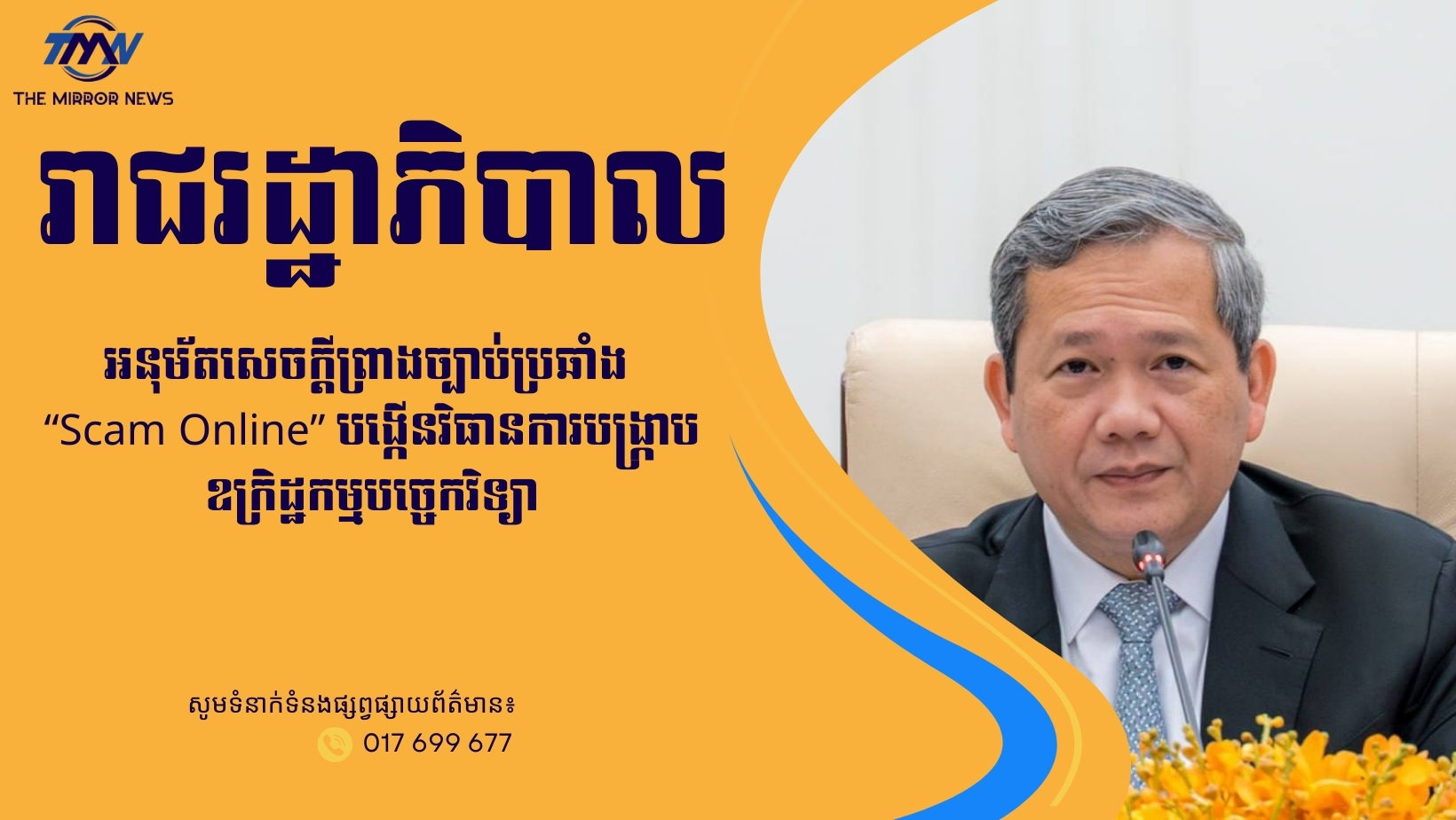 (ភ្នំពេញ)៖ សម្តេចមហាបវរធិបតី ហ៊ុន ម៉ាណែត នាយករដ្ឋមន្ត្រី នៃព្រះរាជាណាចក្រកម្ពុជាបានដឹកនាំកិច្ចប្រជុំពេញអង្គគណៈរដ្ឋមន្ត្រី នៅវិមានសន្តិភាព នាព្រឹកថ្ងៃទី១៣ ខែមីនា ឆ្នាំ២០២៦ ដោយបានពិភាក្សា និងអនុម័ត សេចក្តីព្រាងច្បាប់ស្តីពីការប្រឆាំងការឆបោកតាមប្រព័ន្ធបច្ចេកវិទ្យា។