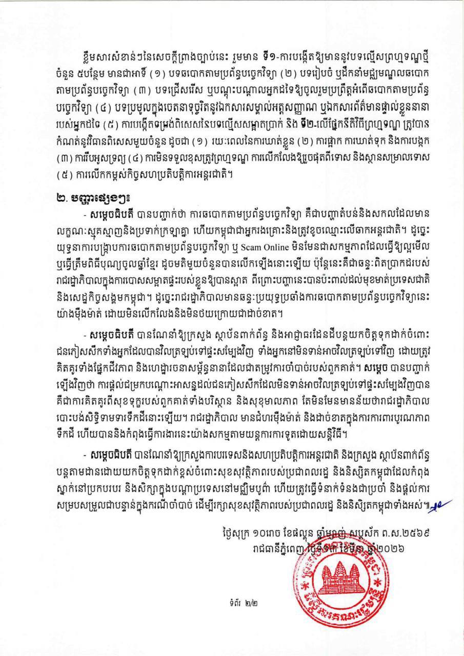 ក្នុងកិច្ចប្រជុំដដែល សម្តេចធិបតីបានបញ្ជាក់ថា ការបង្ក្រាប Scam Online គឺជាឆន្ទៈពិតប្រាកដរបស់រាជរដ្ឋាភិបាល ដើម្បីការពារសន្តិសុខសង្គម កែលម្អមុខមាត់ប្រទេសលើឆាកអន្តរជាតិ និងបន្តប្រយុទ្ធប្រឆាំងឧក្រិដ្ឋកម្មបច្ចេកវិទ្យា ដោយមិនថយក្រោយឡើយ។