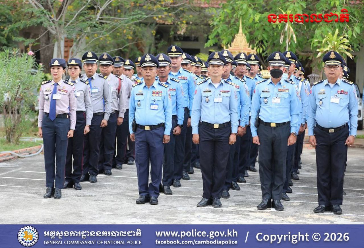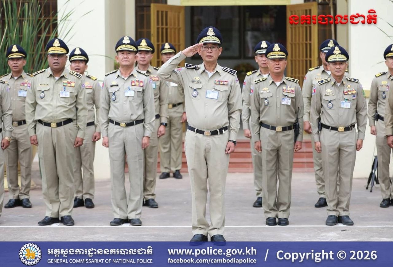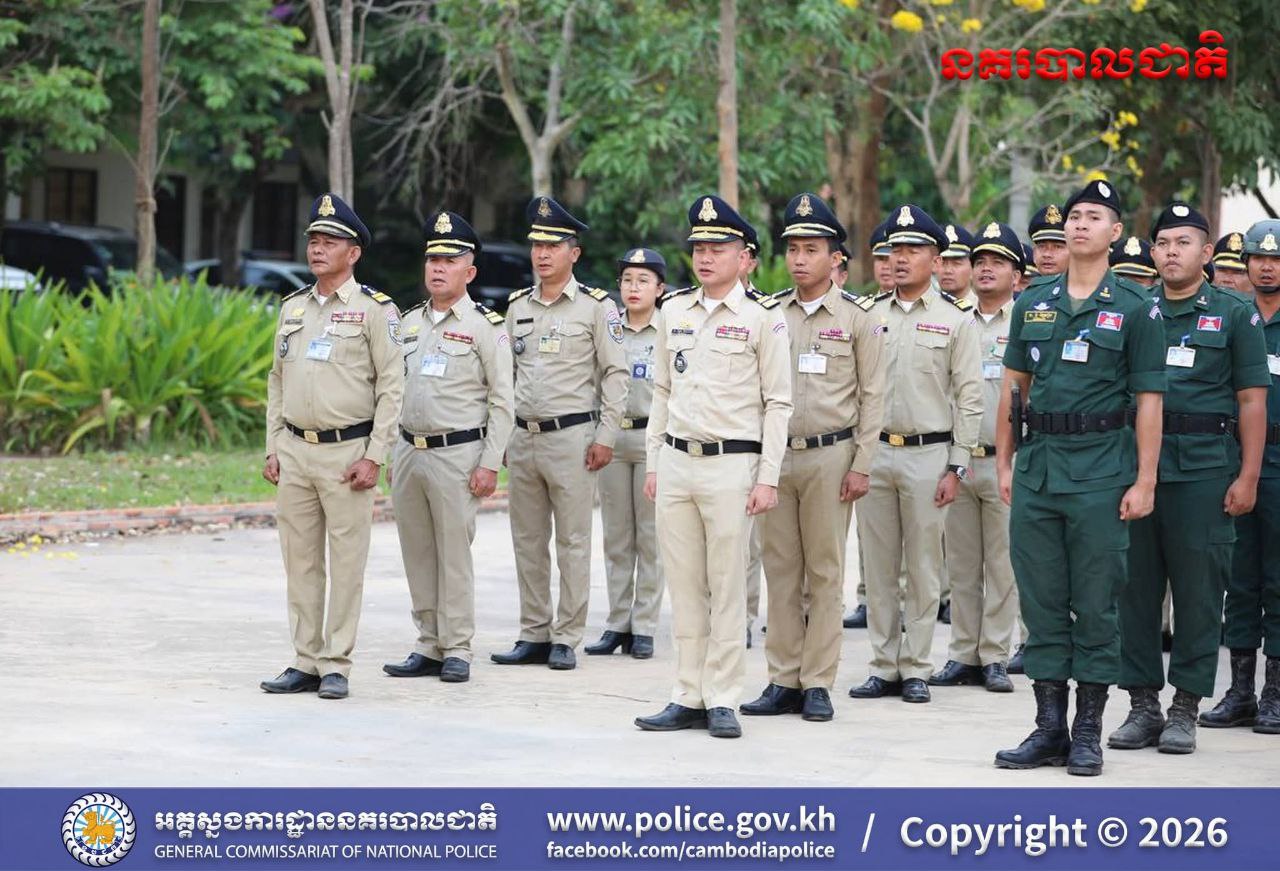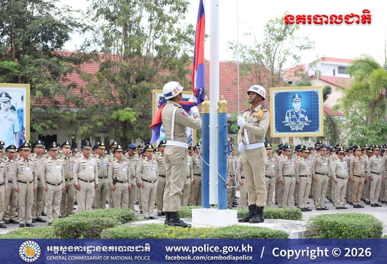 (បន្ទាយមានជ័យ)៖ នៅព្រឹកថ្ងៃចន្ទ ទី១៦ ខែមីនា ឆ្នាំ២០២៦ លោកឧត្តមសេនីយ៍ត្រី សឿម សារិទ្ធ ស្នងការនៃស្នងការដ្ឋាននគរបាលខេត្តបន្ទាយមានជ័យ បានដឹកនាំកម្លាំងនគរបាលទូទាំងខេត្ត ចូលរួមពិធីគោរពទង់ជាតិនៃព្រះរាជាណាចក្រកម្ពុជា។