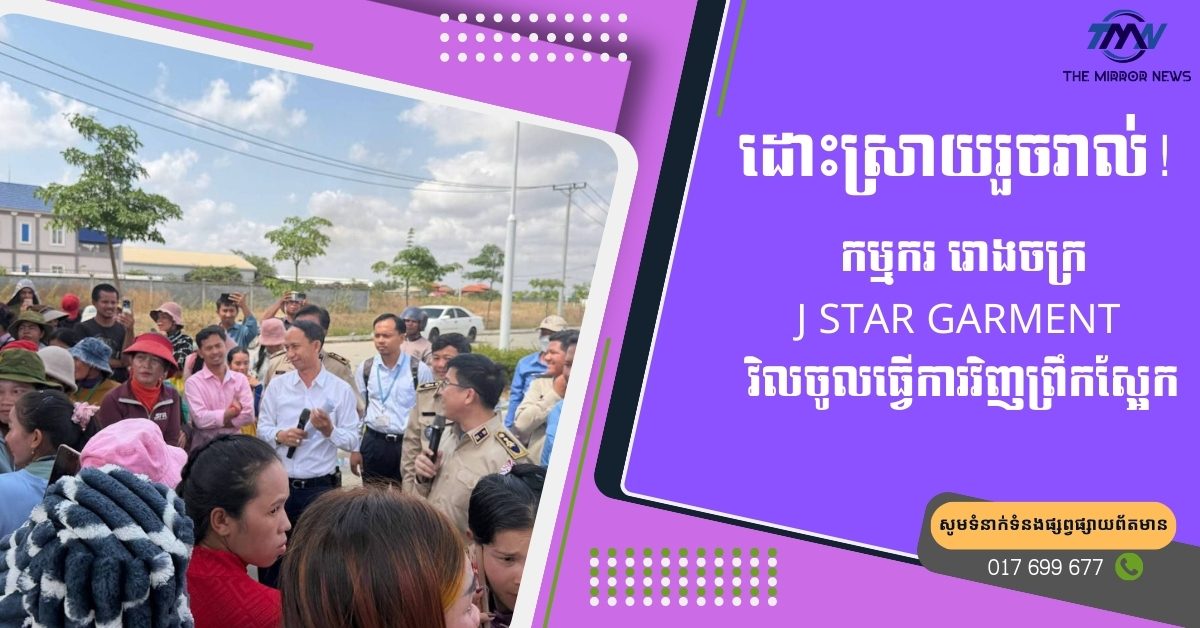 (ភ្នំពេញ)៖ ការទាមទាររបស់កម្មករកម្មការិនី រោងចក្រ J Star Garment នៅខេត្តកំពង់ស្ពឺ ត្រូវបានដោះស្រាយបញ្ចប់សព្វគ្រប់នៅថ្ងៃទី១៨ ខែមីនា ឆ្នាំ២០២៦ ខណៈកម្មករនឹងវិលចូលធ្វើការវិញជាធម្មតា នៅព្រឹកថ្ងៃទី១៩ ខែមីនា ឆ្នាំ២០២៦ស្អែកនេះ។