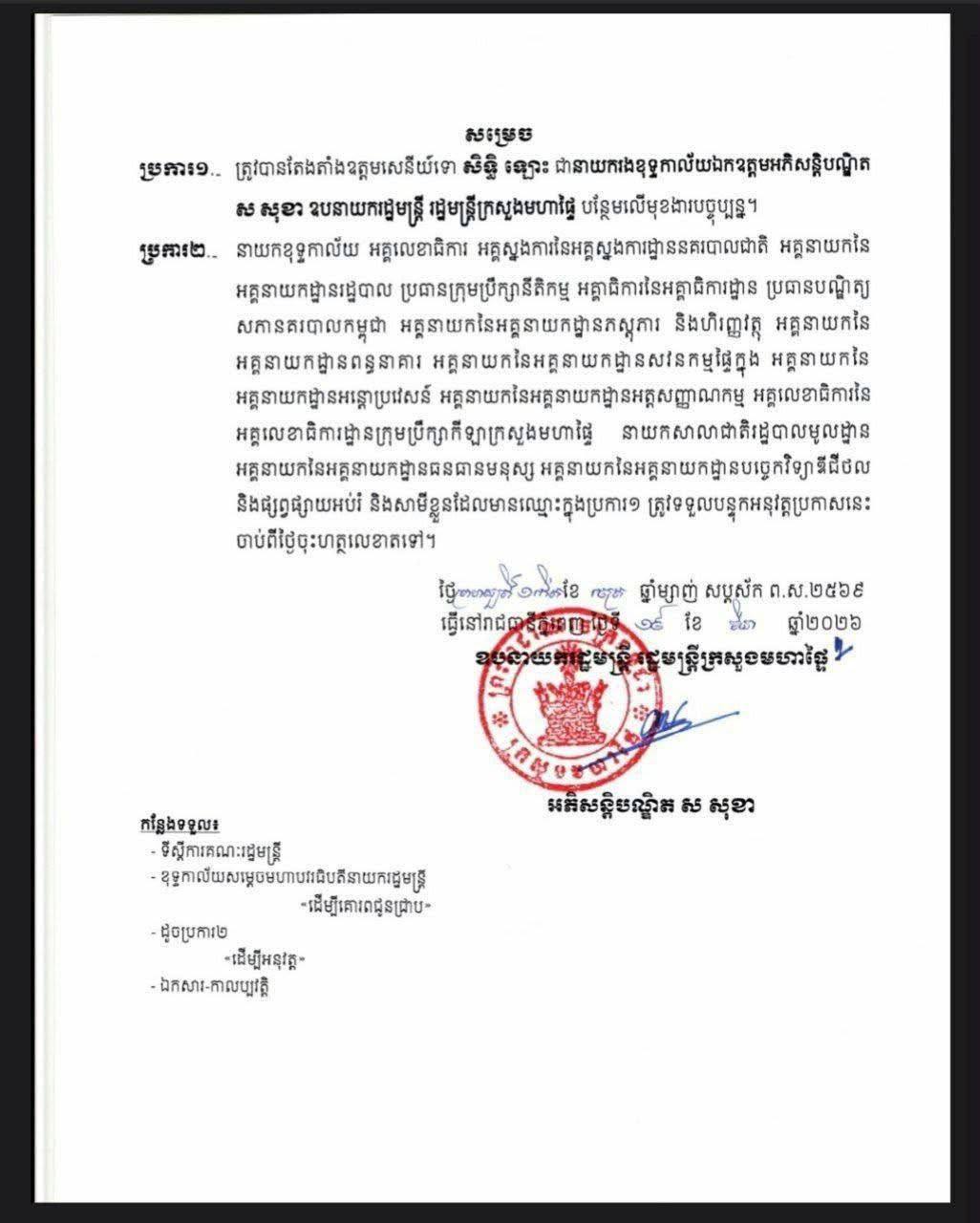 (ភ្នំពេញ)៖ ឧបនាយករដ្ឋមន្ត្រី រដ្ឋមន្ត្រីក្រសួងមហាផ្ទៃ បានសម្រេចតែងតាំង លោកឧត្តមសេនីយ៍ទោ សិទ្ធិ ឡោះ ឲ្យកាន់តំណែងជា «នាយករងខុទ្ទកាល័យ» របស់ឯកឧត្តមអភិសន្តិបណ្ឌិត ស សុខា បន្ថែមលើមុខងារបច្ចុប្បន្ន។
