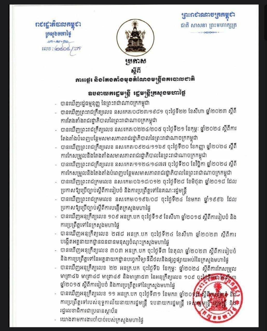 សេចក្ដីសម្រេចក៏បានបញ្ជាក់ឲ្យអង្គភាពពាក់ព័ន្ធទាំងអស់ក្រោមក្រសួងមហាផ្ទៃ អនុវត្តភារកិច្ចនេះឲ្យមានប្រសិទ្ធភាព ចាប់ពីថ្ងៃចុះហត្ថលេខាតទៅ ដើម្បីធានាបាននូវការបំពេញការងារដោយរលូន និងមានប្រសិទ្ធភាពខ្ពស់។