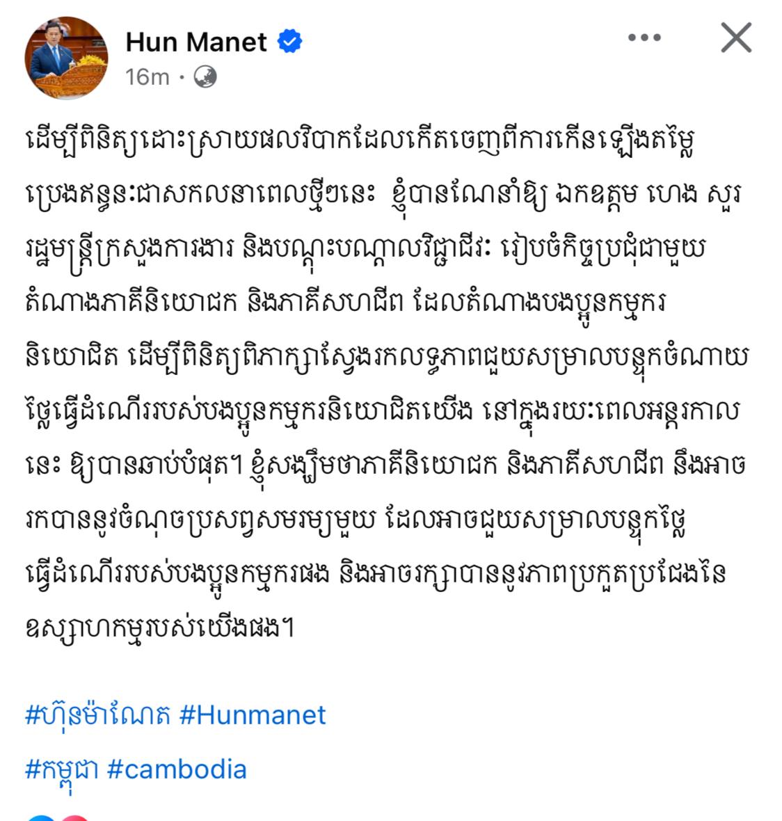 ដោយផ្អែកលើស្ថានភាពជាក់ស្តែងនេះ សម្ដេចធិបតី ហ៊ុន ម៉ាណែត បានណែនាំឱ្យ ឯកឧត្តម ហេង សួរ រដ្ឋមន្ត្រីក្រសួងការងារ និងបណ្តុះបណ្តាលវិជ្ជាជីវៈ រៀបចំកិច្ចប្រជុំជាមួយតំណាងភាគីនិយោជក និងភាគីសហជីព ដែលតំណាងឱ្យបងប្អូនកម្មករនិយោជិត ដើម្បីពិនិត្យ ពិភាក្សា និងស្វែងរកលទ្ធភាពសមស្រប ក្នុងការជួយសម្រាលបន្ទុកចំណាយលើថ្លៃធ្វើដំណើរ។