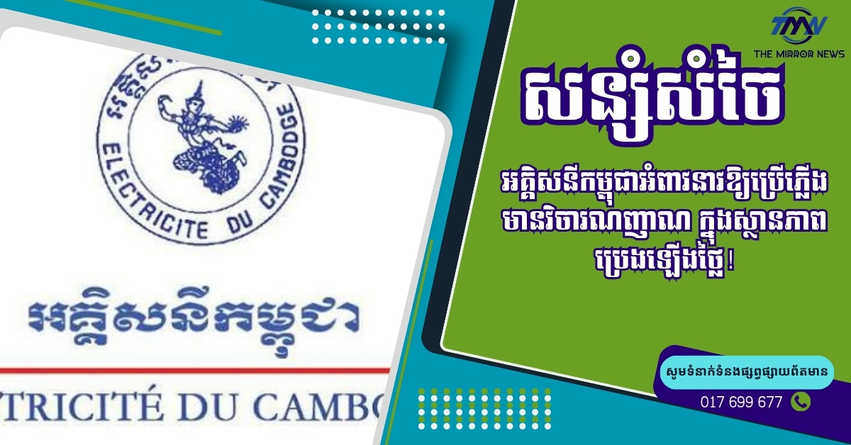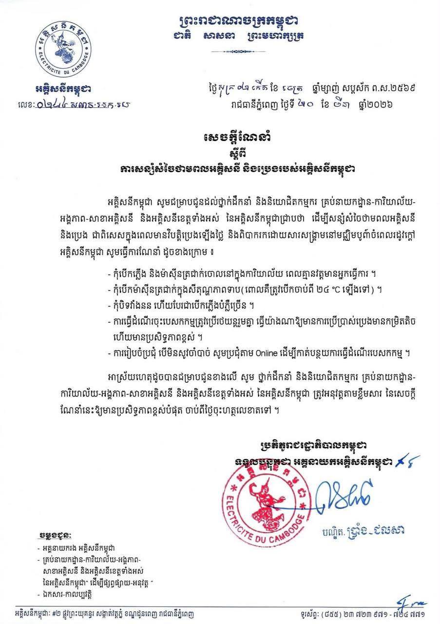 (ភ្នំពេញ)៖ អនុវត្តតាមសារាចរណែនាំរបស់រាជរដ្ឋាភិបាលកម្ពុជា អគ្គិសនីកម្ពុជា បានអំពាវនាវដល់ប្រជាពលរដ្ឋទូទាំងប្រទេស ឱ្យចូលរួមសន្សំសំចៃការប្រើប្រាស់ថាមពលអគ្គិសនី ខណៈតម្លៃប្រេងឥន្ធនៈសកលកំពុងកើនឡើង និងអាកាសធាតុក្តៅកំពុងបន្តរំខាន។