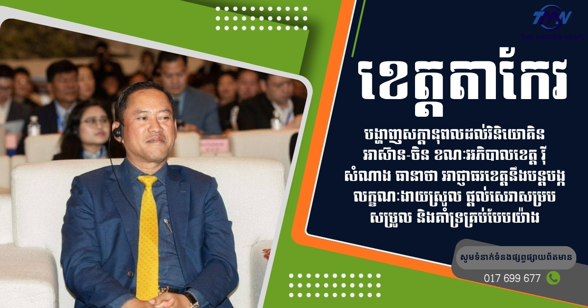 តាកែវបង្ហាញសក្ដានុពលដល់វិនិយោគិនអាស៊ាន-ចិន ខណៈអភិបាលខេត្ត វ៉ី សំណាង ធានាថា អាជ្ញាធរខេត្តនឹងបន្តបង្កលក្ខណៈងាយស្រួល ផ្តល់សេវាសម្របសម្រួល និងគាំទ្រគ្រប់បែបយ៉ាង