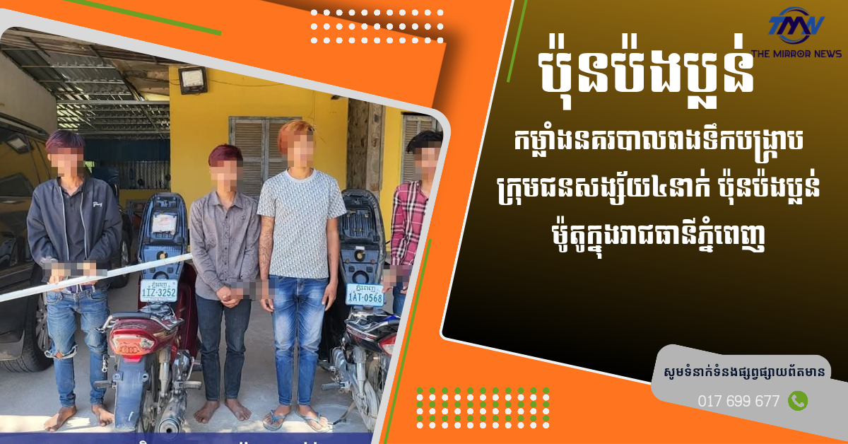 កម្លាំងនគរបាលពងទឹកបង្ក្រាបក្រុមជនសង្ស័យ៤នាក់ ប៉ុនប៉ងប្លន់ម៉ូតូក្នុងរាជធានីភ្នំពេញ