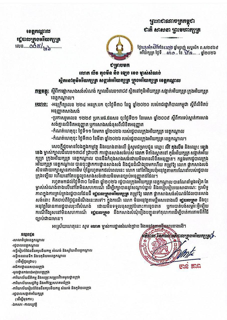 ដោយមិនអនុញ្ញាតឱ្យមានការបំពានច្បាប់បន្តទៀត នៅថ្ងៃទី៣០ ខែមីនា ឆ្នាំ២០២៦ រដ្ឋបាលក្រុងអរិយក្សត្របានចេញវិធានការដាច់ខាត ដោយបញ្ជាឱ្យផ្អាកសកម្មភាពសាងសង់ភ្លាមៗ ហើយបានព្រមានថា ប្រសិនបើម្ចាស់សំណង់នៅតែមិនសហការណ៍ អាជ្ញាធរនឹងអនុវត្តវិធានការរដ្ឋបាលរុះរើ ដោយមិនទទួលខុសត្រូវចំពោះការខូចខាត ឬបាត់បង់សម្ភារៈណាមួយឡើយ ព្រមទាំងអាចបន្តនីតិវិធីច្បាប់ ដោយបញ្ជូនសំណុំរឿងទៅតុលាការផងដែរ។