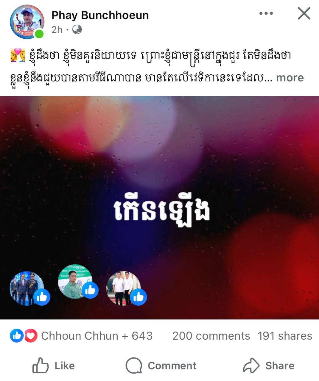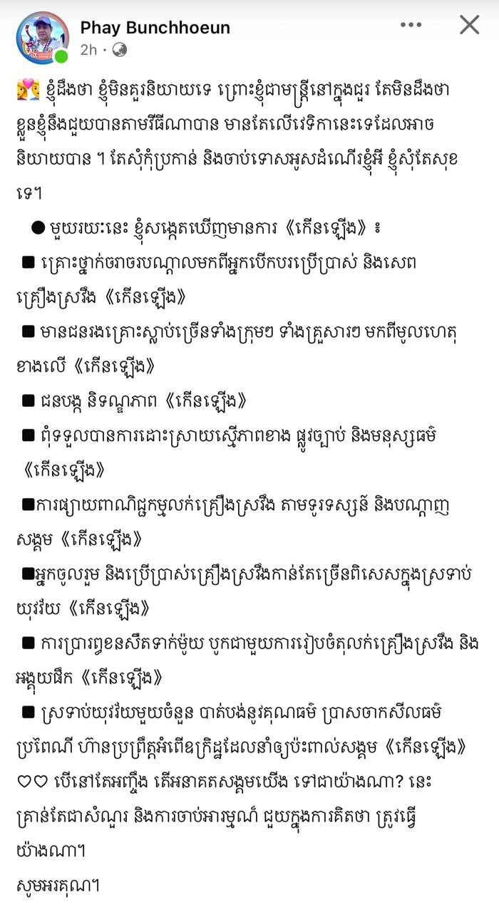 (ភ្នំពេញ)៖ នៅក្នុងសារដែលបង្ហាញពីការព្រួយបារម្ភយ៉ាងជ្រាលជ្រៅរបស់ឯកឧត្ដម ផៃ ប៊ុនឈឿន រដ្ឋមន្ត្រីប្រតិភូអមនាយករដ្ឋមន្ត្រី បានលើកឡើងដោយស្មោះត្រង់ថា ទោះបីជាមន្ត្រីនៅក្នុងប្រព័ន្ធក៏ដោយ ក៏មានអារម្មណ៍ថា មិនអាចនៅស្ងៀមចំពោះបញ្ហាសង្គមដែលកំពុងកើនឡើងជាបន្តបន្ទាប់បានទេ។