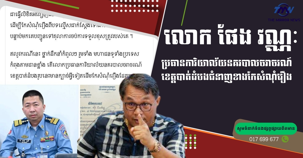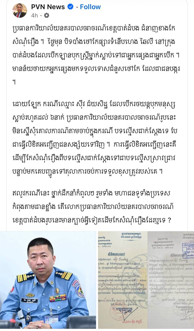 (បាត់ដំបង)៖ ការលើកឡើងរបស់លោក ផែង វណ្ណៈ បានធ្វើឲ្យមហាជនកាន់តែចាប់អារម្មណ៍លើសកម្មភាពអនុវត្តច្បាប់របស់មន្ត្រីនគរបាលចរាចរណ៍ខេត្តបាត់ដំបង ដែលត្រូវបានចោទប្រកាន់ថាមានការកែប្រែសំណុំរឿងក្នុងបែបបទមិនប្រក្រតី។