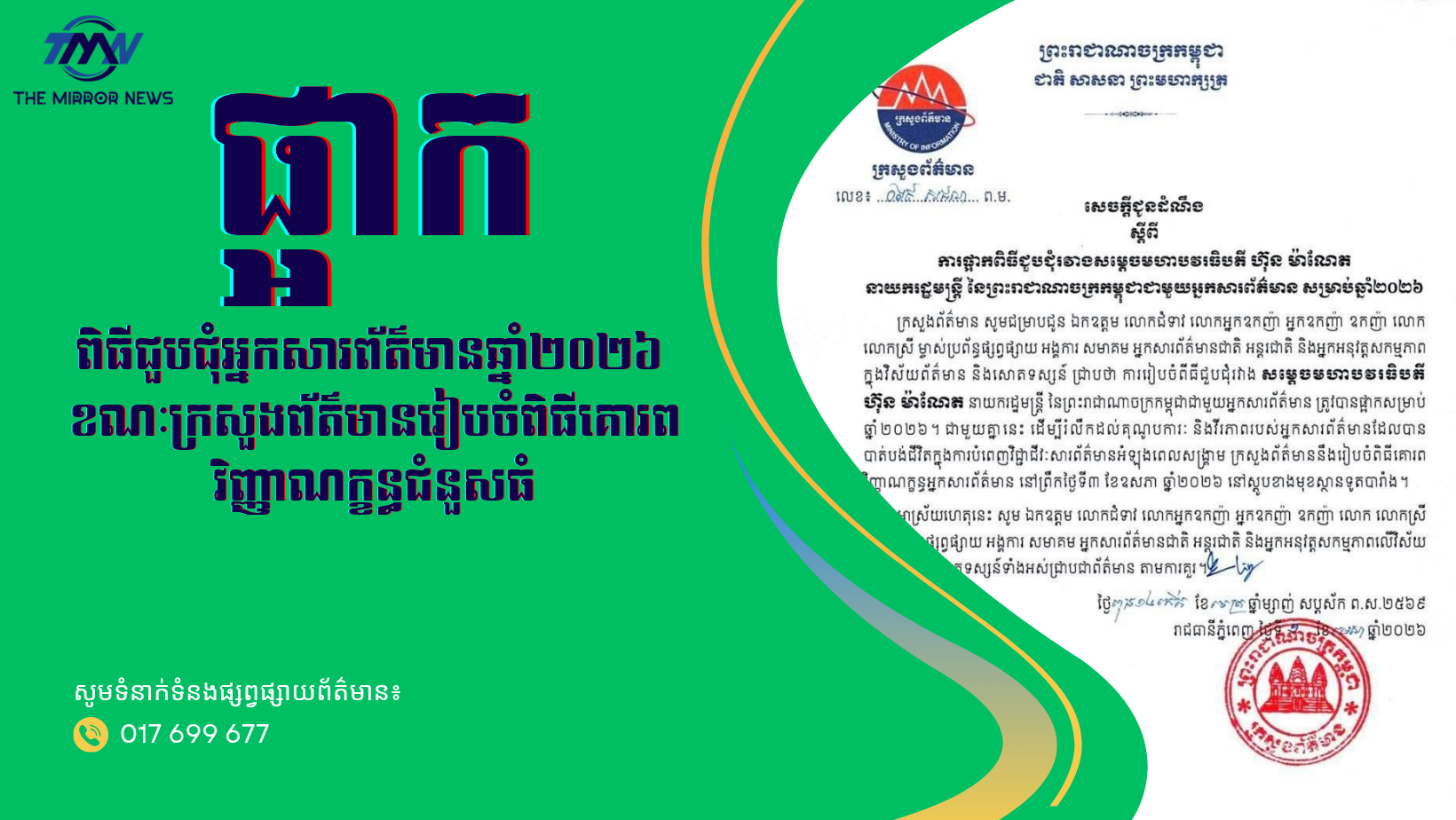 តាមរយៈសេចក្តីជូនដំណឹងនេះ ក្រសួងព័ត៌មានក៏សូមអញ្ជើញ និងជូនដំណឹងដល់ភាគីពាក់ព័ន្ធទាំងអស់ឲ្យបានជ្រាប និងចូលរួមតាមការគួរ ដើម្បីរួមចំណែកក្នុងការគោរព និងរំលឹកដល់អ្នកសារព័ត៌មានដែលបានលះបង់ជីវិត ដើម្បីបម្រើសង្គម និងសេរីភាពព័ត៌មាន៕