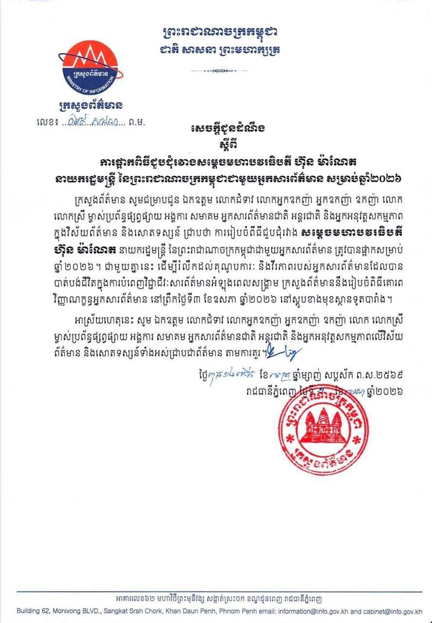 (ភ្នំពេញ)៖ ក្រសួងព័ត៌មានបានចេញសេចក្តីជូនដំណឹងជាផ្លូវការមួយ ដោយជម្រាបជូនដល់ ឯកឧត្តម លោកជំទាវ លោកអ្នកឧកញ៉ា អ្នកឧកញ៉ា ឧកញ៉ា លោក លោកស្រី ម្ចាស់ប្រព័ន្ធផ្សព្វផ្សាយ អង្គការ សមាគម អ្នកសារព័ត៌មានជាតិ និងអន្តរជាតិ ព្រមទាំងអ្នកអនុវត្តសកម្មភាពក្នុងវិស័យព័ត៌មាន និងសោតទស្សន៍ទាំងអស់ឲ្យបានជ្រាបថា ពិធីជួបជុំរវាង សម្តេចមហាបវរធិបតី ហ៊ុន ម៉ាណែត នាយករដ្ឋមន្ត្រី នៃព្រះរាជាណាចក្រកម្ពុជា ជាមួយអ្នកសារព័ត៌មាន សម្រាប់ឆ្នាំ២០២៦ ត្រូវបានសម្រេចផ្អាក។