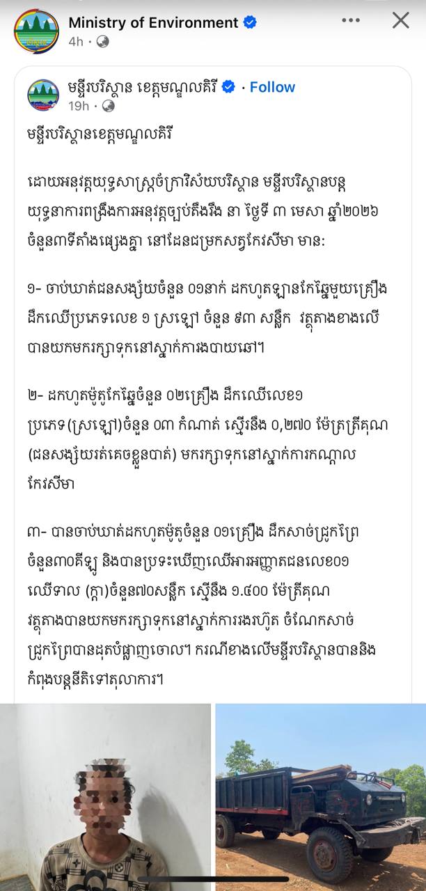 (មណ្ឌលគិរី)៖ ដោយអនុវត្តយុទ្ធសាស្ត្រចក្រាវិស័យបរិស្ថាន និងគោលនយោបាយពង្រឹងការអនុវត្តច្បាប់ឱ្យមានប្រសិទ្ធភាព មន្ទីរបរិស្ថានខេត្តមណ្ឌលគិរី បានបន្តដឹកនាំកម្លាំងជំនាញ ចុះអនុវត្តយុទ្ធនាការបង្ក្រាបបទល្មើសធនធានធម្មជាតិយ៉ាងតឹងរឹង នៅថ្ងៃទី៣ ខែមេសា ឆ្នាំ២០២៦ នៅតំបន់ដែនជម្រកសត្វព្រៃកែវសីមា ដោយរកឃើញ និងចាត់វិធានការនៅ៣ទីតាំងផ្សេងគ្នា។