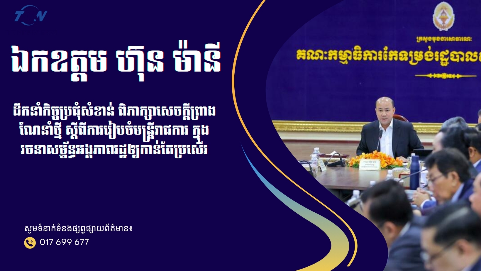 ឯកឧត្តម ហ៊ុន ម៉ានី ដឹកនាំកិច្ចប្រជុំសំខាន់ ពិភាក្សាសេចក្តីព្រាងណែនាំថ្មី ស្តីពីការរៀបចំមន្ត្រីរាជការ ក្នុងរចនាសម្ព័ន្ធអង្គភាពរដ្ឋឲ្យកាន់តែប្រសើរ