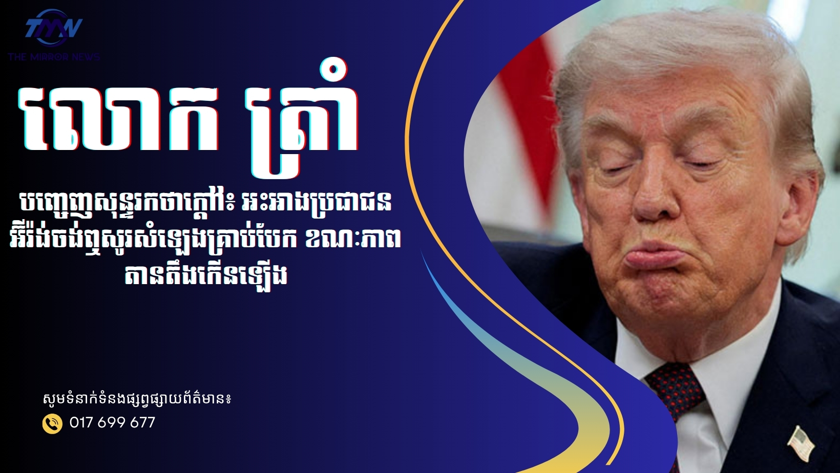 (អន្តរជាតិ)៖ លោក Donald Trump ប្រធានាធិបតីសហរដ្ឋអាមេរិក បានបង្កការចាប់អារម្មណ៍យ៉ាងខ្លាំងលើឆាកអន្តរជាតិ បន្ទាប់ពីលោកបានលើកឡើងថា ប្រជាជនអ៊ីរ៉ង់ចង់ឮសូរសំឡេងទម្លាក់គ្រាប់បែកពីសហរដ្ឋអាមេរិក ព្រោះពួកគេចង់បានសេរីភាព ខណៈភាពតានតឹងរវាងភាគីពាក់ព័ន្ធនៅតែបន្តកើនឡើង។