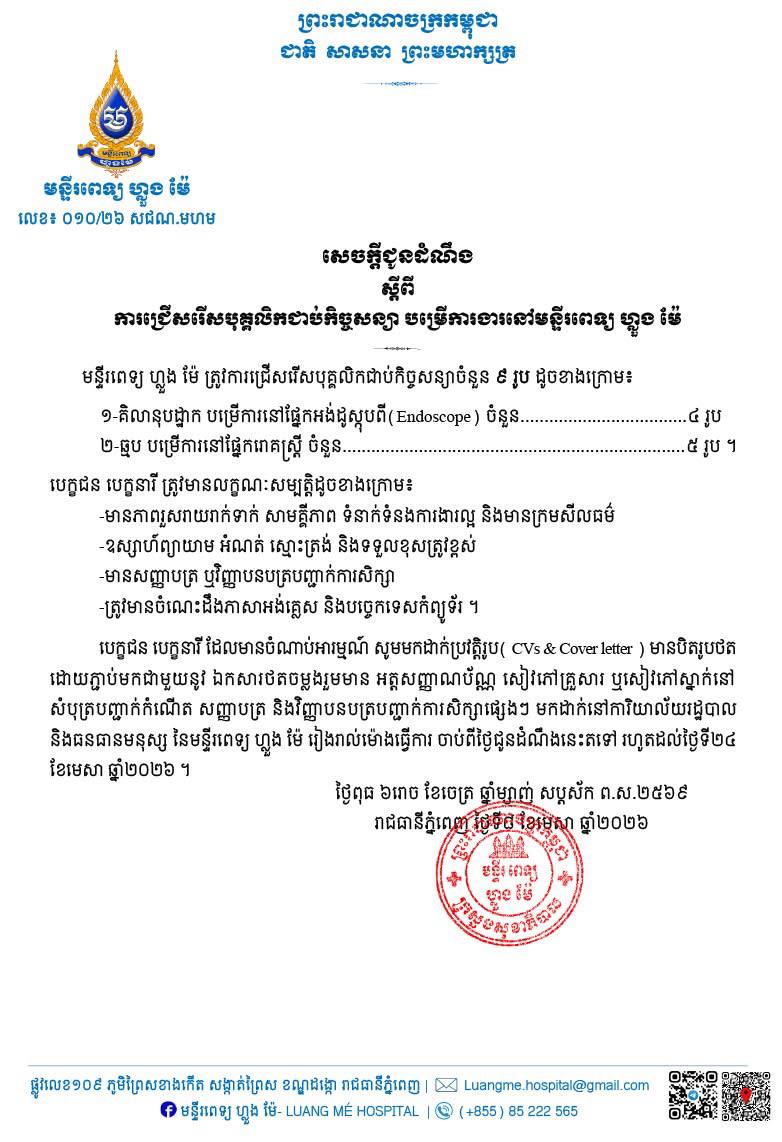 មន្ទីរពេទ្យ ហ្លួង ម៉ែ ប្រកាសជ្រើសរើសបុគ្គលិកជាប់កិច្ចសន្យាចំនួន៩នាក់