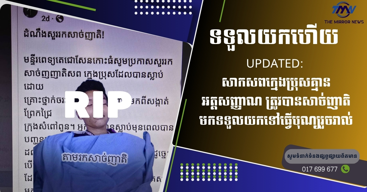 Updated: សាកសពក្មេងប្រុសគ្មានអត្តសញ្ញាណ ត្រូវបានសាច់ញាតិមកទទួលយកទៅធ្វើបុណ្យរួចរាល់