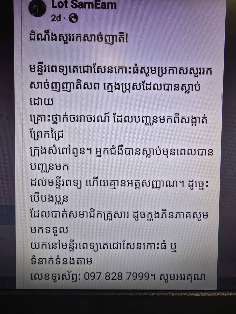 (កណ្ដាល)៖ សាកសពក្មេងប្រុសម្នាក់ ដែលបានស្លាប់ក្នុងគ្រោះថ្នាក់ចរាចរណ៍ ហើយមិនមានអត្តសញ្ញាណបញ្ជាក់ ត្រូវបានសាច់ញាតិមកទទួលយកទៅធ្វើបុណ្យតាមប្រពៃណីរួចរាល់ហើយ បន្ទាប់ពីមន្ទីរពេទ្យបានចេញសេចក្តីជូនដំណឹងស្វែងរកអស់រយៈពេលមួយ។