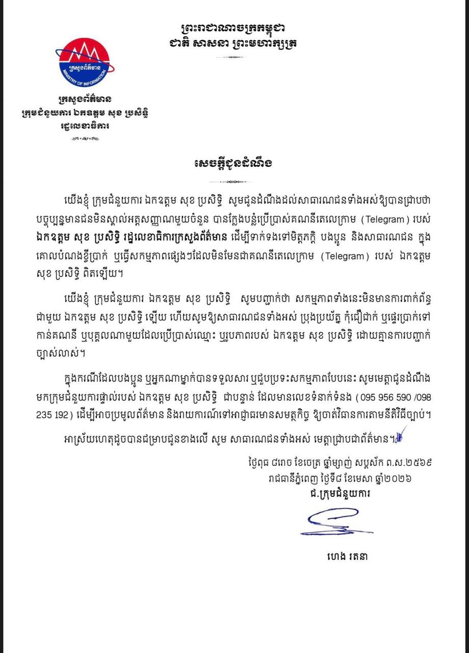 (ភ្នំពេញ)៖ ក្រុមជំនួយការ​របស់ ឯកឧត្តម សុខ ប្រសិទ្ធិ រដ្ឋលេខាធិការក្រសួងព័ត៌មាន បានចេញសេចក្តីជូនដំណឹងបន្ទាន់មួយ ដើម្បីជូនដំណឹងដល់សាធារណជន ឱ្យបង្កើនការប្រុងប្រយ័ត្នខ្ពស់ ពាក់ព័ន្ធនឹងសកម្មភាពក្លែងបន្លំតាមបណ្តាញសង្គម។