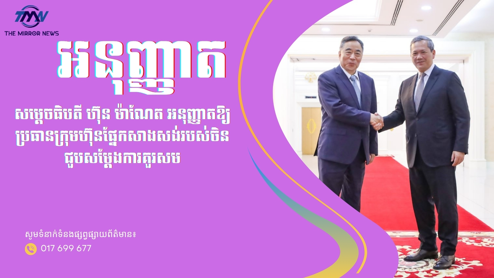 សម្តេចធិបតី ហ៊ុន ម៉ាណែត អនុញ្ញាតឱ្យប្រធានក្រុមហ៊ុនផ្នែកសាងសង់របស់ចិន ជួបសម្តែងការគួរសម