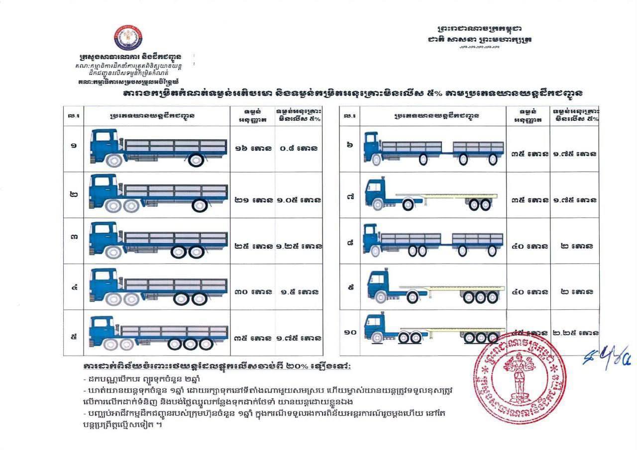 ក្រសួងសាធារណការ និងដឹកជញ្ជូន បានធ្វើការក្រើនរំលឹកយ៉ាងតឹងរ៉ឹងដល់ម្ចាស់ក្រុមហ៊ុនដឹកជញ្ជូនធុនធ្ងន់ ម្ចាស់យានយន្ត និងអ្នកបើកបរ ទាំងអស់ ឱ្យគោរពតាមច្បាប់ និងអនុវត្តតាមតម្រាយផ្លូវអនុញ្ញាតសម្រាប់យានយន្តចាប់ពីភ្លៅ៦ឡើងទៅ ដូចដែលក្រសួងបានកំណត់។