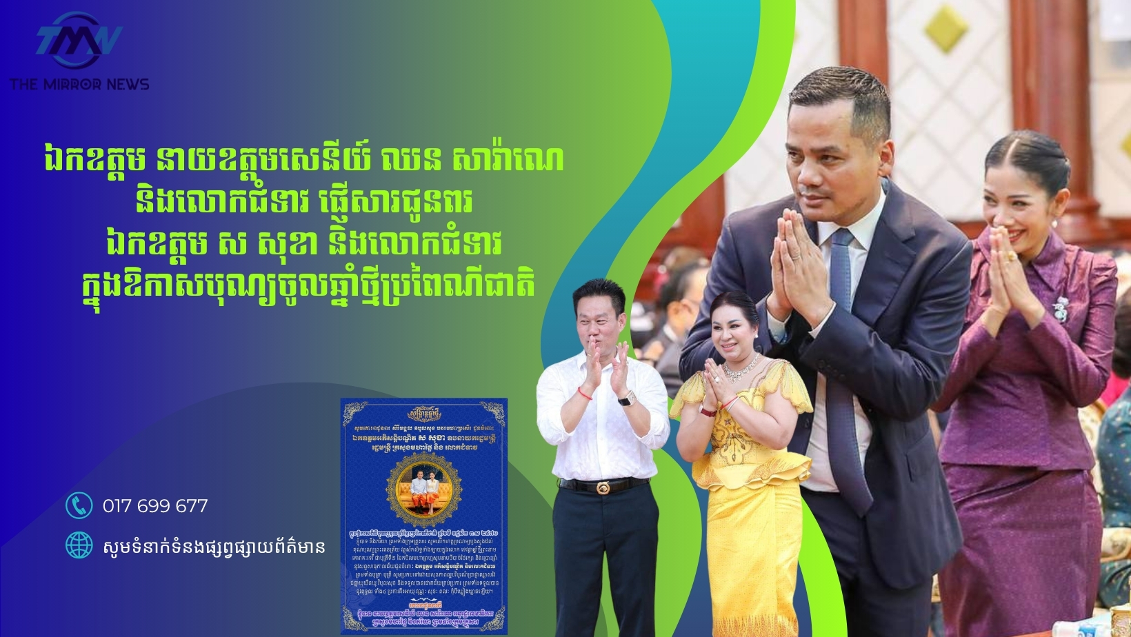 ឯកឧត្តម នាយឧត្តមសេនីយ៍និងលោកជំទាវ ក៏សូមគោរពបួងសួងឱ្យឯកឧត្តមឧបនាយករដ្ឋមន្ត្រី និងលោកជំទាវ ព្រមទាំងបុត្រ និងក្រុមគ្រួសារ ទទួលបានពុទ្ធពរទាំងបួនប្រការ គឺ អាយុ វណ្ណៈ សុខៈ ពលៈ កុំបីឃ្លៀងឃ្លាតឡើយ ដើម្បីបន្តបំពេញបេសកកម្មដ៏ឧត្តុង្គឧត្តម ក្នុងការបម្រើជាតិ សាសនា និងព្រះមហាក្សត្រ ឱ្យកាន់តែរីកចម្រើនរុងរឿង។