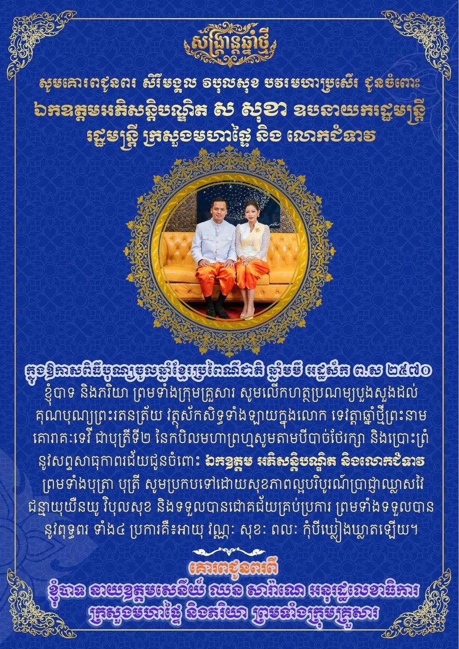 ឯកឧត្តម នាយឧត្តមសេនីយ៍ ឈន សារ៉ាណេ និងលោកជំទាវ ផ្ញើសារជូនពរ ឯកឧត្តម ស សុខា ក្នុងឱកាសបុណ្យចូលឆ្នាំថ្មីប្រពៃណីជាតិ