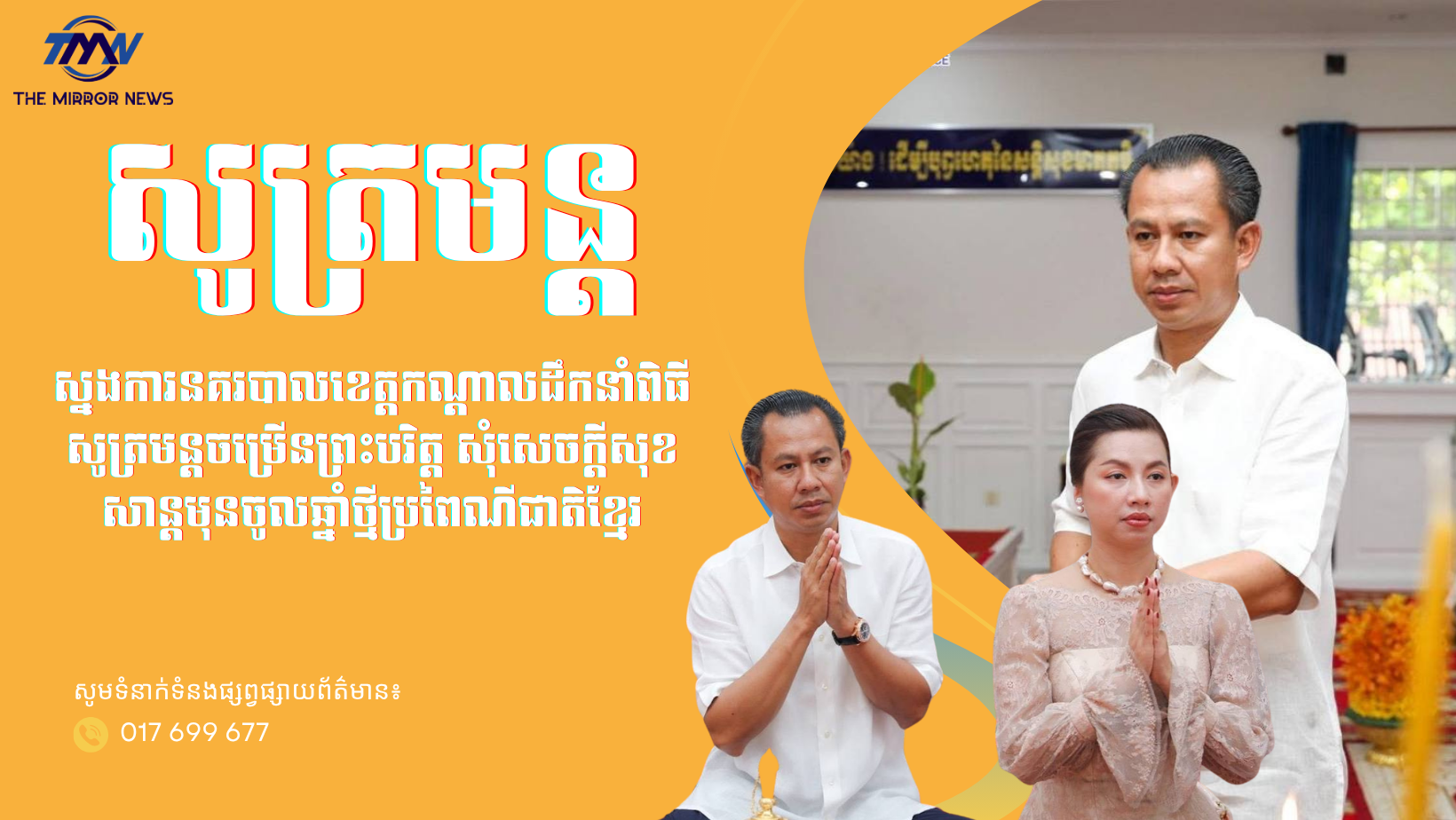 (កណ្តាល)៖ លោកឧត្តមសេនីយ៍ទោ ឈឿន សុចិត្ត ស្នងការនគរបាលខេត្តកណ្តាល និងលោកស្រី រ៉េត ផល្លីដា រួមជាមួយកងកម្លាំងនគរបាលក្រោមឱវាទ នៅរសៀលថ្ងៃព្រហស្បត្តិ៍ ៩រោច ខែចេត្រ ឆ្នាំម្សាញ់ សប្តស័ក ពុទ្ធសករាជ ២៥៦៩ ត្រូវនឹងថ្ងៃទី៩ ខែមេសា ឆ្នាំ២០២៦ បានអញ្ជើញចូលរួមក្នុងពិធីសូត្រមន្តចម្រើនព្រះបរិត្ត នៅស្នងការដ្ឋាននគរបាលខេត្តកណ្តាល ដើម្បីអបអរសាទរ និងស្វាគមន៍បុណ្យចូលឆ្នាំថ្មីប្រពៃណីជាតិខ្មែរ ឆ្នាំមមី អដ្ឋស័ក ព.ស.២៥៧០ គ.ស.២០២៦។