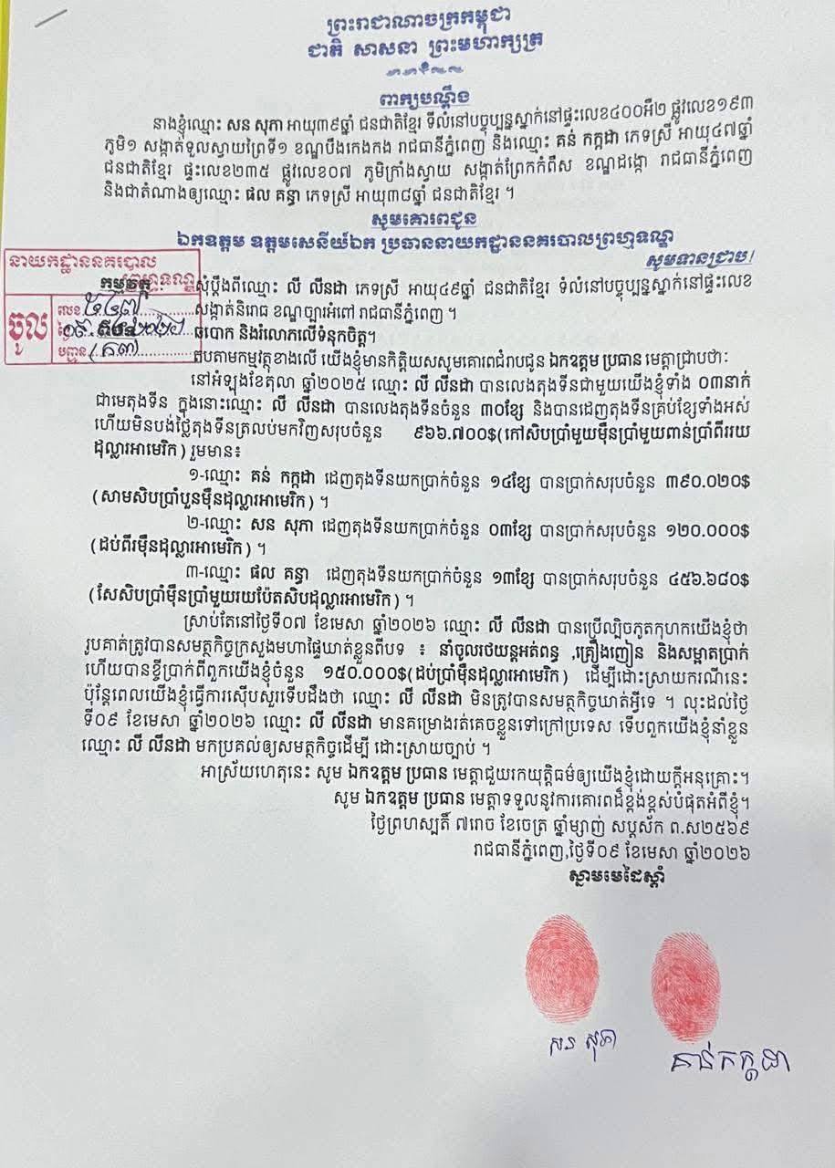 យោងតាមពាក្យបណ្តឹងរបស់ជនរងគ្រោះ៣នាក់ ចុះថ្ងៃទី៩ ខែមេសា ឆ្នាំ២០២៦ បានឱ្យដឹងថា ស្ត្រីឈ្មោះ លី លីនដា (Kelly Kelly) បានចូលរួមលេងតុងទីនចំនួន៣០ខ្សែ ហើយដេញយកប្រាក់គ្រប់ខ្សែ ប៉ុន្តែមិនបានបង់ប្រាក់ត្រឡប់វិញ សរុបចំនួន ៩៦៦,៧០០ដុល្លារ។