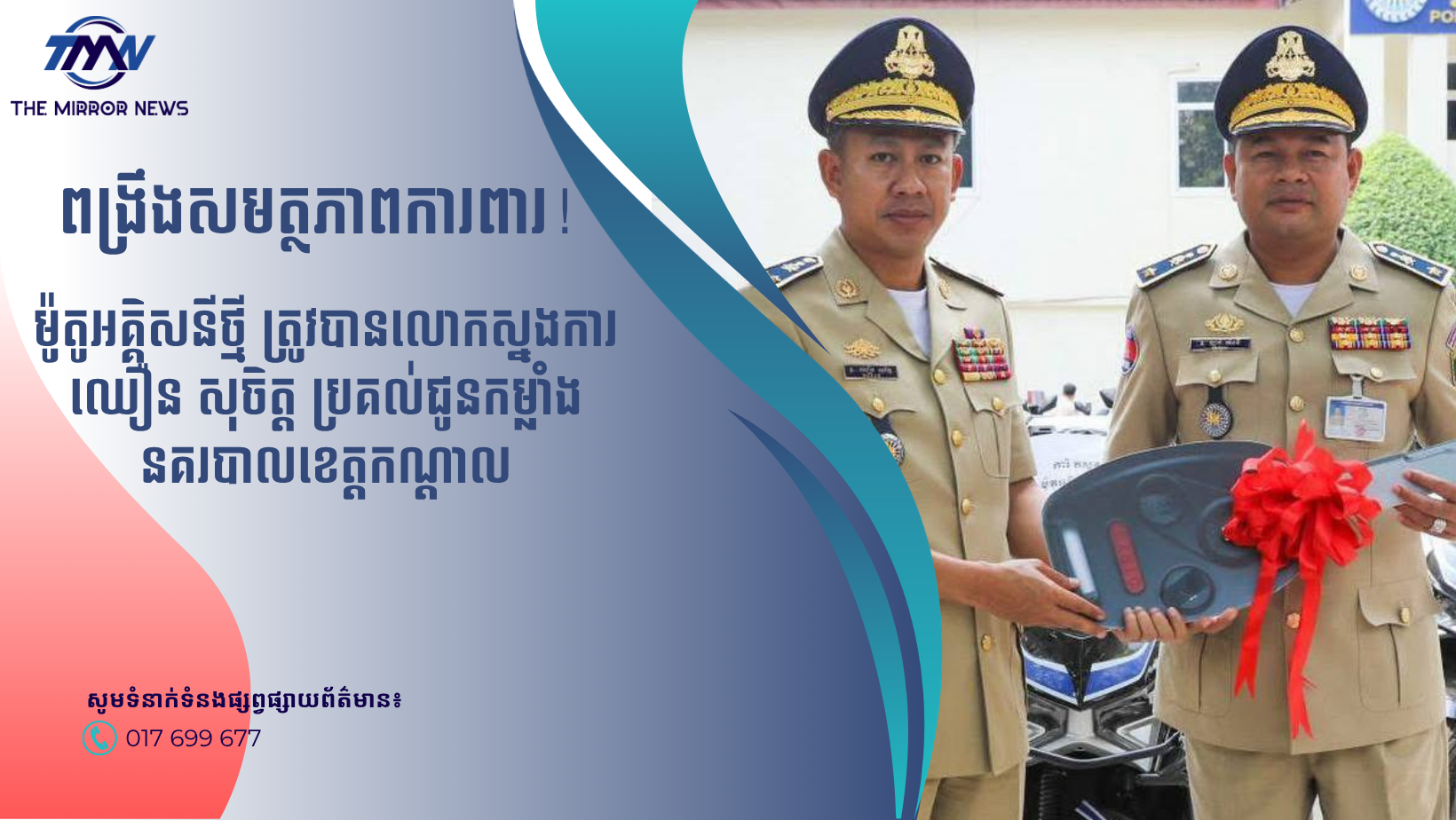 ពិធីប្រគល់-ទទួលម៉ូតូអគ្គិសនីនេះ បានប្រារព្ធធ្វើឡើងក្រោមអធិបតីភាពដ៌ខ្ពង់ខ្ពស់លោកឧត្តមសេនីយ៍ទោ ឈឿន សុចិត្ត ស្នងការនគរបាលខេត្តកណ្តាល ដោយអនុវត្តតាមបទបញ្ជាចង្អុលដឹកនាំដ៏ខ្ពង់ខ្ពស់របស់ ឯកឧត្តម នាយឧត្តមសេនីយ៍ ស ថេត អគ្គស្នងការនគរបាលជាតិ។