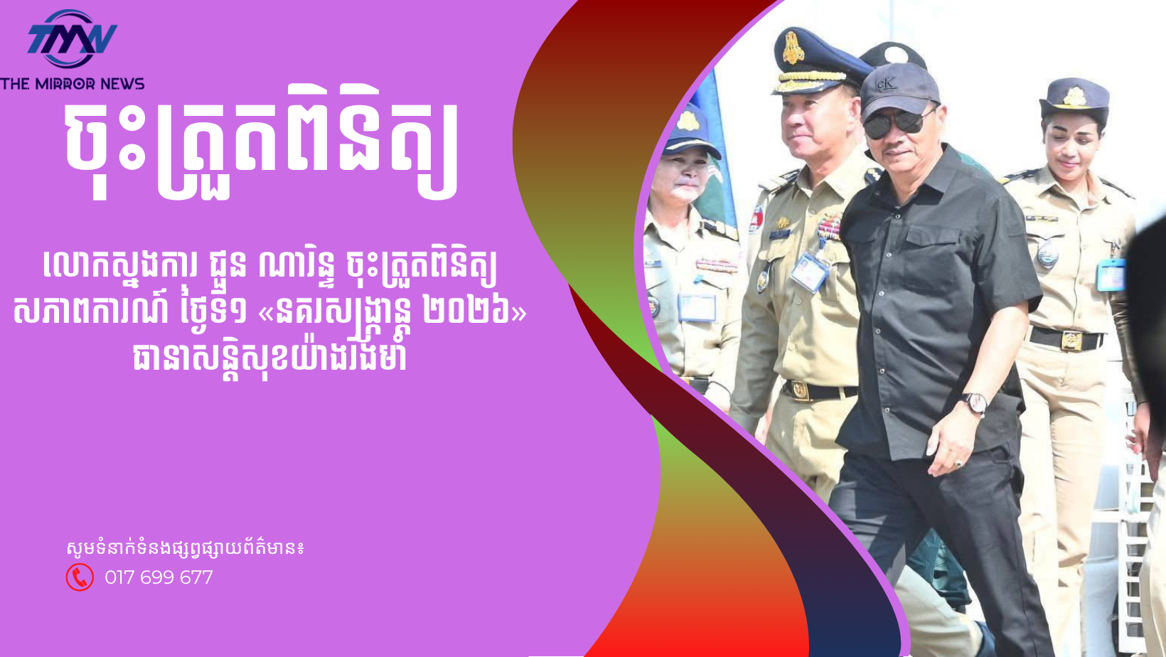 (ភ្នំពេញ)៖ នារសៀលថ្ងៃទី១៤ ខែមេសា ឆ្នាំ២០២៦ ដែលជាថ្ងៃទី១ នៃពិធីបុណ្យចូលឆ្នាំថ្មី ប្រពៃណីជាតិខ្មែរ ឯកឧត្តម ឧត្តមសេនីយ៍ឯក ជួន ណារិន្ទ អគ្គស្នងការរង និងជាស្នងការនគរបាលរាជធានីភ្នំពេញ បានចុះត្រួតពិនិត្យសភាពការណ៍ទូទៅ និងពិនិត្យកម្លាំងសមត្ថកិច្ច ដើម្បីបង្កើនប្រសិទ្ធភាពការពារ រក្សាសណ្តាប់ធ្នាប់ និងធានាសន្តិសុខជូនប្រជាពលរដ្ឋ។