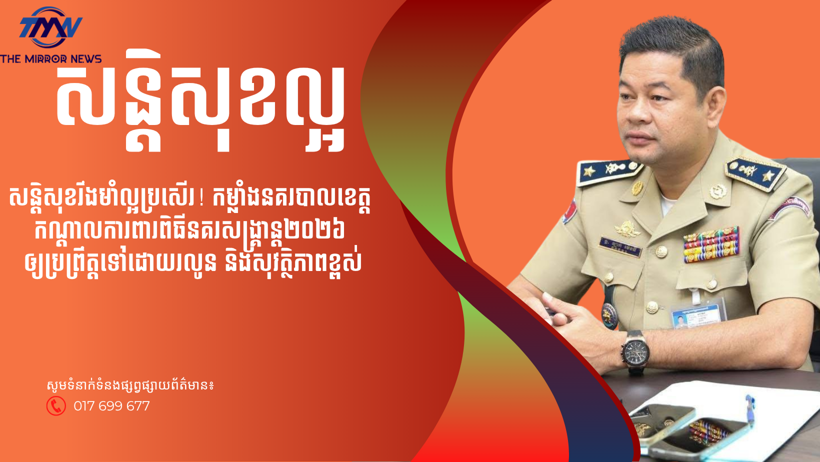 (កណ្ដាល)៖ នៅថ្ងៃទី១ នៃពិធីនគរសង្គ្រាន្តឆ្នាំ២០២៦ ខេត្តកណ្ដាល កម្លាំងនគរបាលខេត្តកណ្ដាល ក្រោមការដឹកនាំយ៉ាងម៉ឺងម៉ាត់ និងមានប្រសិទ្ធភាពពីលោកឧត្តមសេនីយ៍ទោ ឈឿន សុចិត្ត ស្នងការនគរបាលខេត្តបានបំពេញភារកិច្ចការពារសន្តិសុខ សណ្ដាប់ធ្នាប់ និងសុវត្ថិភាពសាធារណៈបានយ៉ាងល្អប្រសើរ បង្កើតបរិយាកាសមានរបៀបរៀបរយ និងសុខសាន្តជូនប្រជាពលរដ្ឋ។ នេះបើតាមការបញ្ជាក់របស់លោកឧត្ដមសេនីយ៍ត្រី ឡាក់ ម៉េងធី ស្នងការរងទទួលផែនការងារព្រហ្មទណ្ឌនិងជាអ្នកនាំពាក្យនៃស្នងការដ្ឋាននគរបាលខេត្តកណ្តាល។