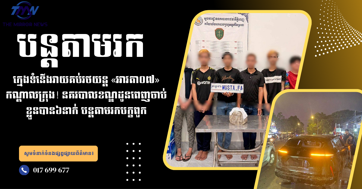 (ភ្នំពេញ)៖ ក្រុមក្មេងទំនើងដែលធ្វើសកម្មភាពហិង្សាវាយ និងគប់រថយន្តមួយគ្រឿងម៉ាកអាវតា០៧ ស៊េរីឆ្នាំ២០២៥ ពណ៌ខ្មៅ បណ្ដាលឲ្យរងការខូចខាត បន្ទាប់ពីមានជម្លោះពាក់ព័ន្ធគ្រោះថ្នាក់ចរាចរណ៍ជាមួយម៉ូតូ ត្រូវបានកម្លាំងនគរបាលជំនាញធ្វើការស្រាវជ្រាវ និងឃាត់ខ្លួនបានចំនួន៦នាក់ហើយ។