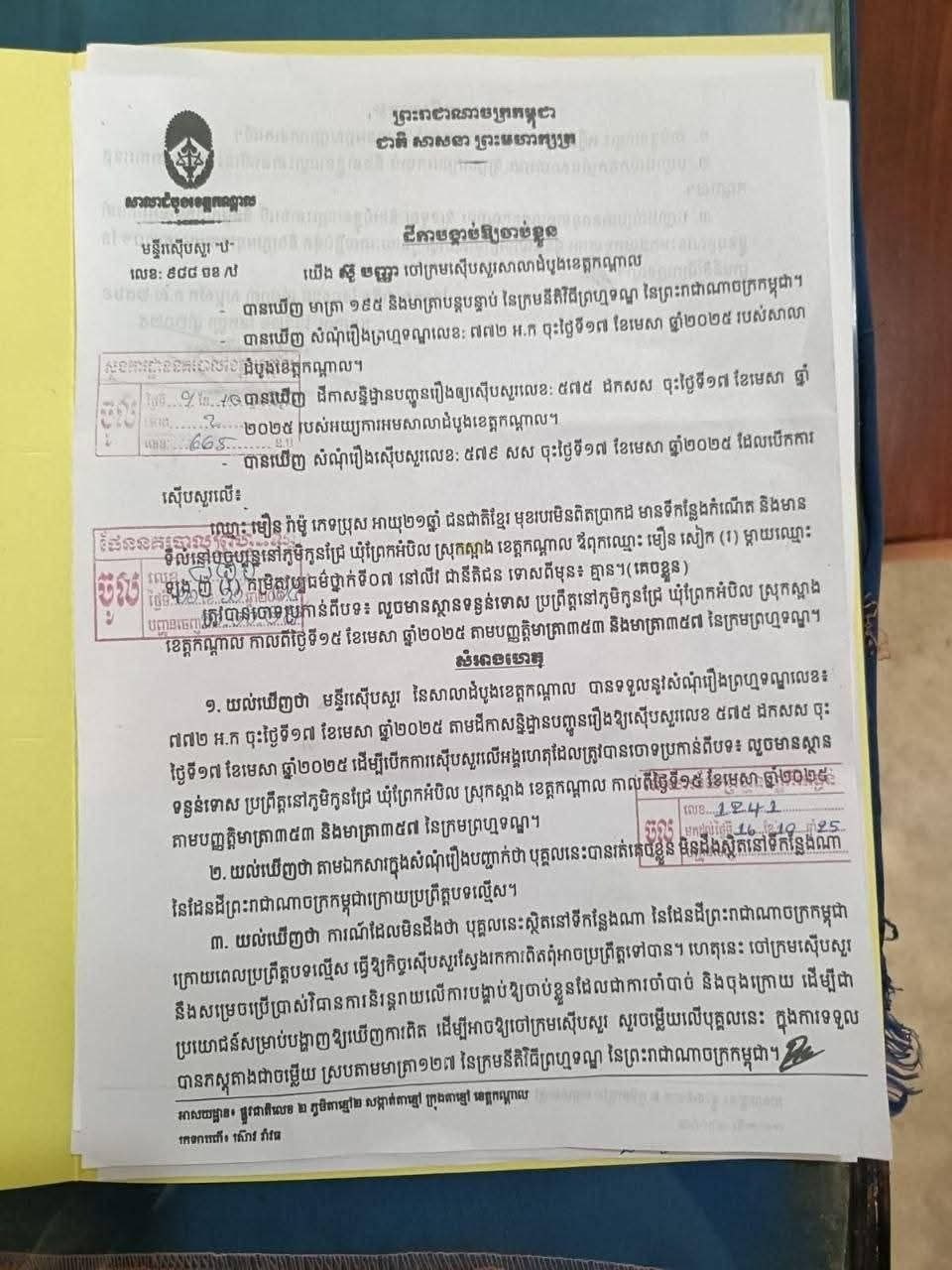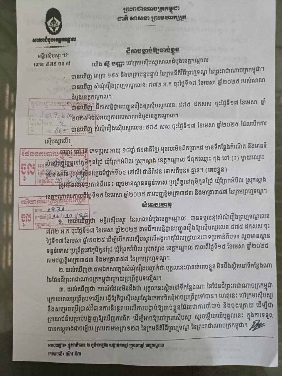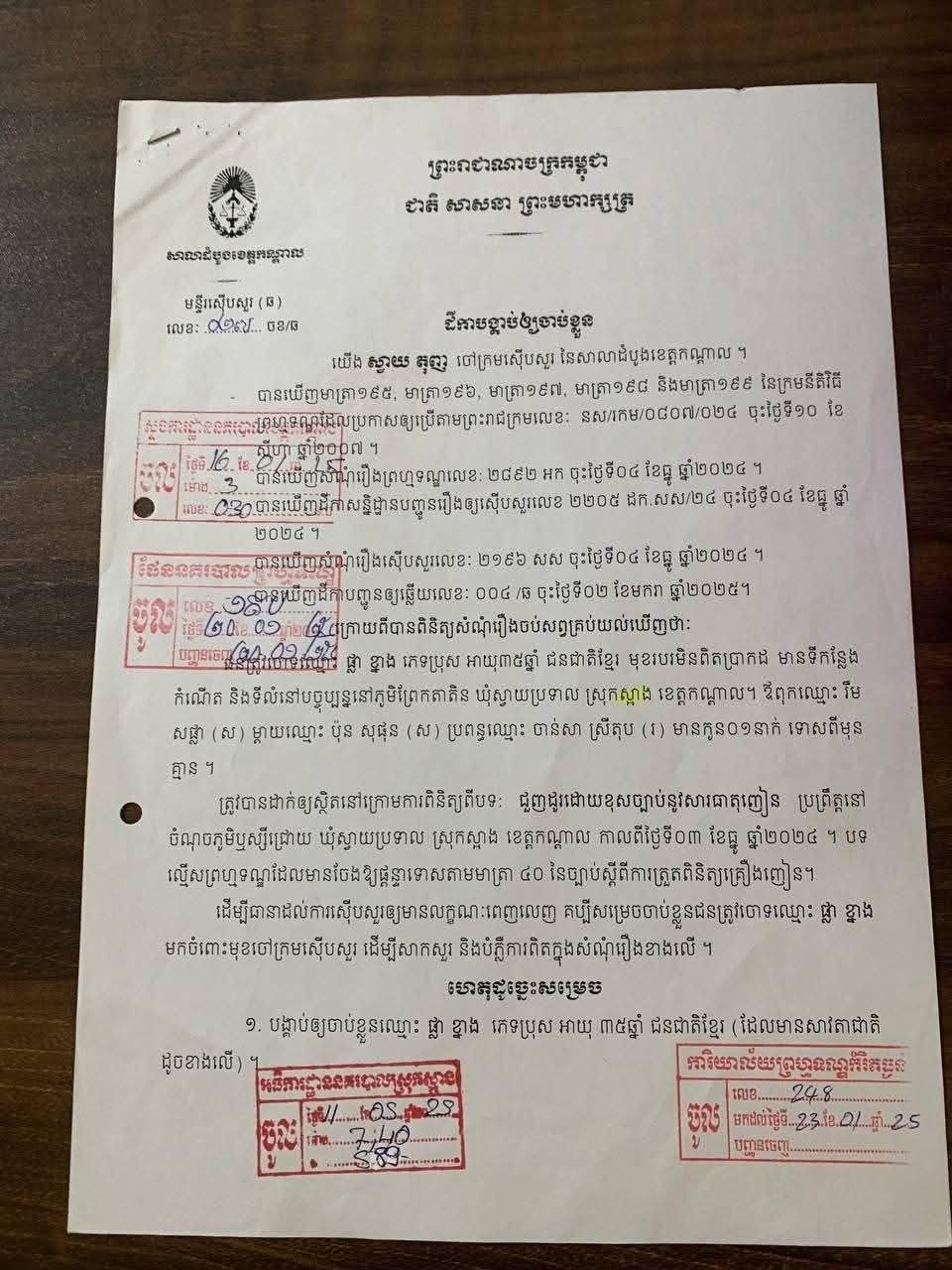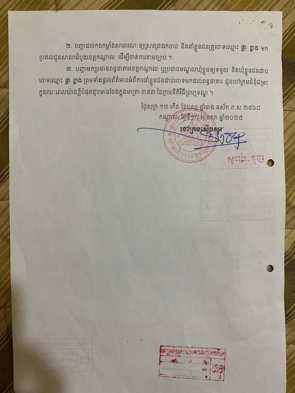 (កណ្ដាល)៖ ក្រោមបទបញ្ជាយ៉ាងម៉ឺងម៉ាត់របស់លោកឧត្ដមសេនីយ៍ទោ ឈឿន សុចិត្ត​​ ស្នងការនគរបាលខេត្តកណ្ដាល កម្លាំងនគរបាលស្រុកស្អាងបានបង្ហាញប្រសិទ្ធភាពការងារផ្នែកអនុវត្តច្បាប់ ដោយបើកប្រតិបត្តិការស្រាវជ្រាវ និងអនុវត្តដីកាបង្គាប់ឲ្យចាប់ខ្លួនពីសាលាដំបូងខេត្តកណ្ដាល ដោយឃាត់ខ្លួនជនត្រូវចោទសរុបចំនួន៣នាក់ ក្នុងរយៈពេល២ថ្ងៃជាប់គ្នា គឺថ្ងៃទី១៦ និងទី១៧ ខែមេសា ឆ្នាំ២០២៦ ពាក់ព័ន្ធនឹងករណីផ្សេងៗគ្នា។