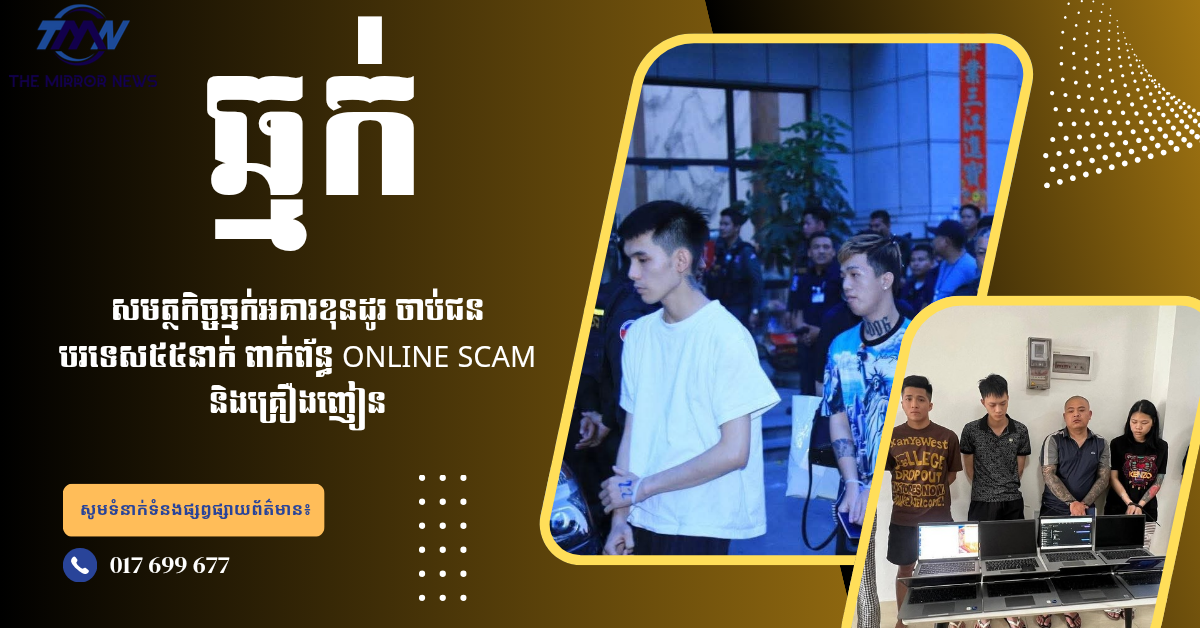 (ភ្នំពេញ)៖ ក្នុងការបន្តពង្រឹងសន្តិសុខសង្គម និងទប់ស្កាត់បទល្មើសបច្ចេកវិទ្យា កម្លាំងគណៈបញ្ជាការឯកភាពរាជធានីភ្នំពេញ បានបើកប្រតិបត្តិការចុះបង្ក្រាបទីតាំងសង្ស័យមួយ ស្ថិតនៅអគារខុនដូរ ZHUOYUFENG ក្នុងខណ្ឌមានជ័យ ដោយឃាត់ខ្លួនជនបរទេសសរុប ៥៥នាក់ ពាក់ព័ន្ធនឹងសកម្មភាពឆបោកតាមប្រព័ន្ធអនឡាញ និងបទល្មើសគ្រឿងញៀន។