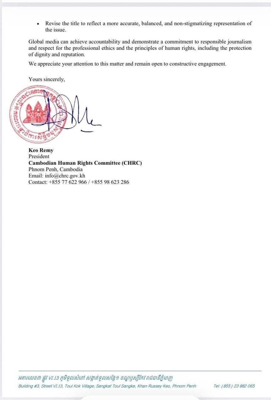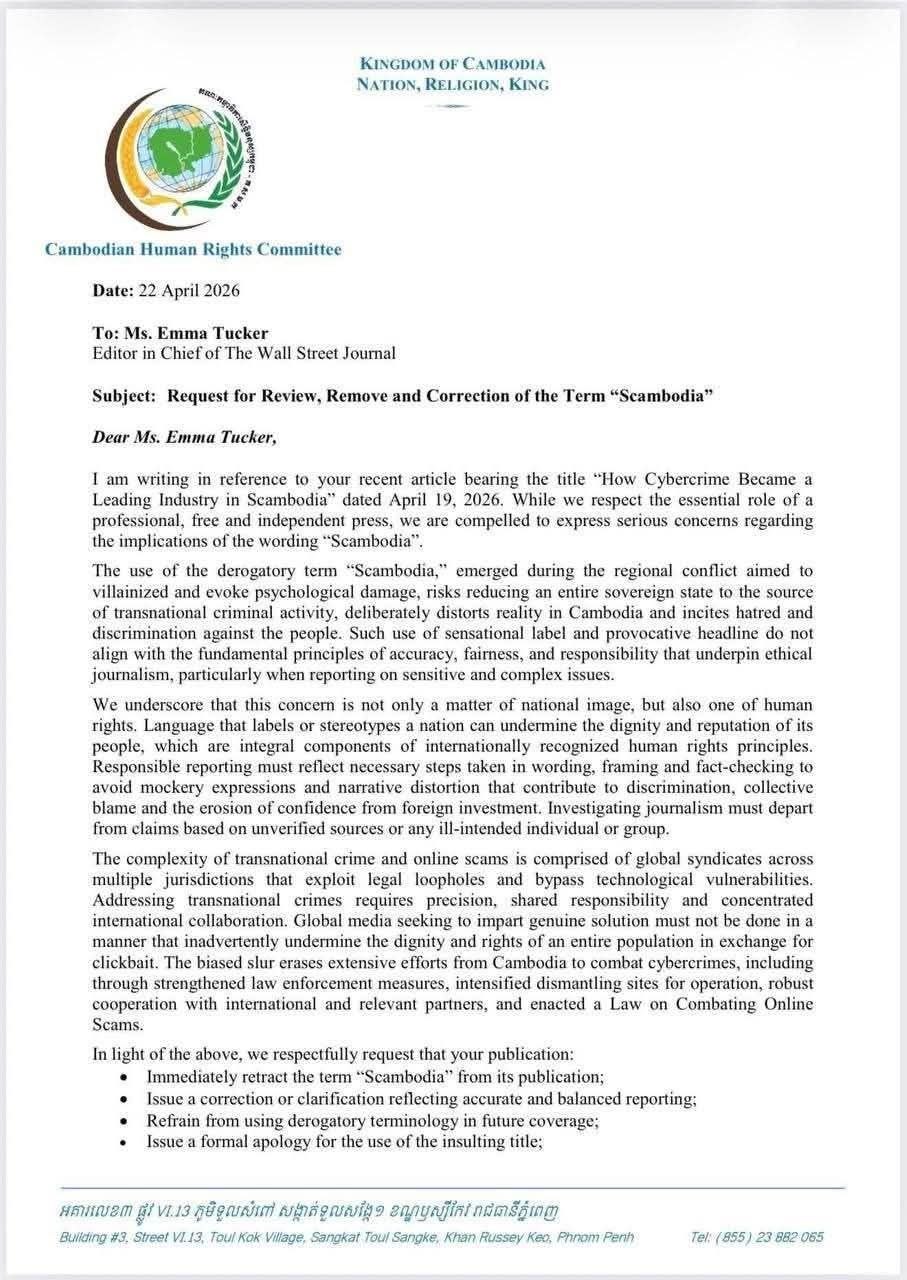 (ភ្នំពេញ)៖ គណៈកម្មាធិការសិទ្ធិមនុស្សកម្ពុជា (គ.ស.ម.ក.) បានផ្ញើលិខិតជាផ្លូវការទៅកាន់ The Wall Street Journal បន្ទាប់ពីសារព័ត៌មានអន្តរជាតិមួយនេះ បានប្រើប្រាស់ពាក្យ «Scambodia» ក្នុងអត្ថបទមួយ ដែលត្រូវបានផ្សាយកាលពីថ្ងៃទី១៩ ខែមេសា ឆ្នាំ២០២៦ ដោយចាត់ទុកថា ជាការប៉ះពាល់យ៉ាងធ្ងន់ធ្ងរដល់កិត្តិយសជាតិ និងសេចក្តីថ្លៃថ្នូររបស់ប្រជាជនកម្ពុជា។