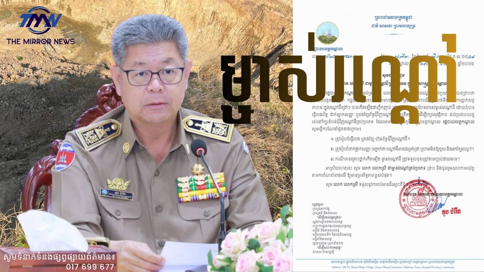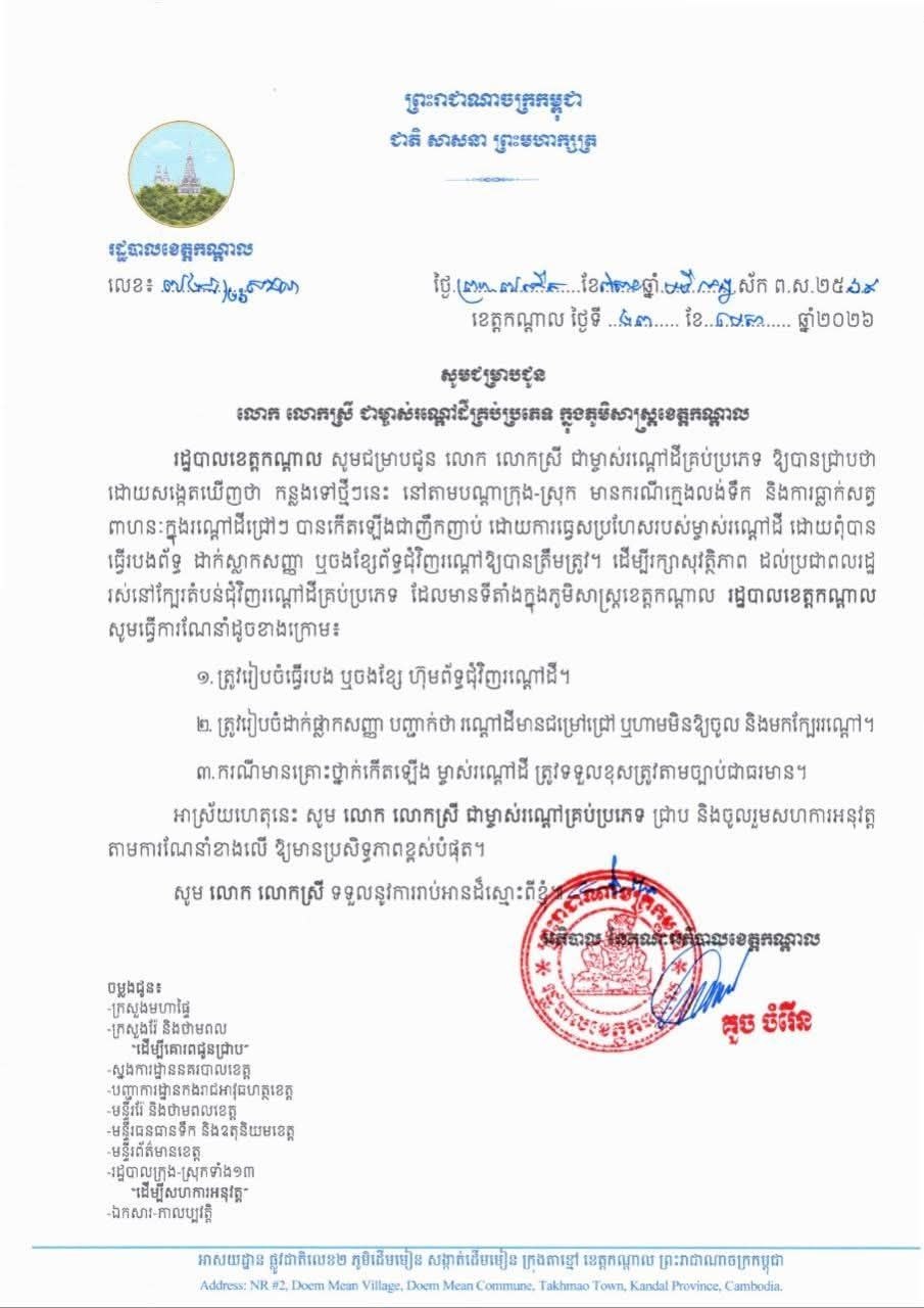 រដ្ឋបាលខេត្តកណ្តាលជូនដំណឹងដល់ម្ចាស់រណ្តៅដីទាំងអស់ បង្កើនវិធានការសុវត្ថិភាព បន្ទាប់ពីកើតមានហានិភ័យជាញឹកញាប់