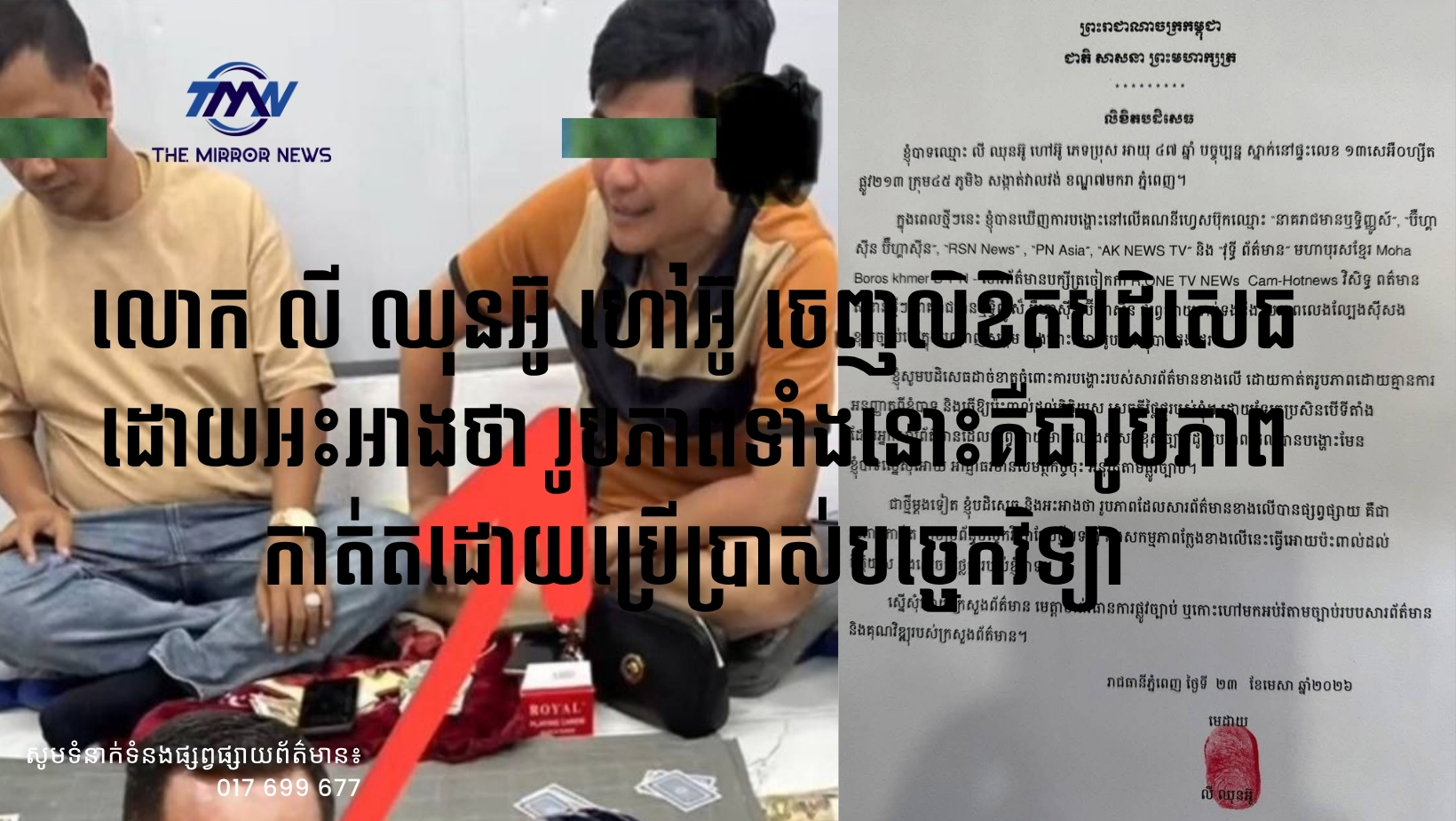 (ភ្នំពេញ)៖ នៅថ្ងៃទី២៣ ខែមេសា ឆ្នាំ២០២៦ លោក លី ឈុនអ៊ូ ហៅអ៊ូ ភេទប្រុស អាយុ ៤៧ឆ្នាំ បច្ចុប្បន្នស្នាក់នៅសង្កាត់វាលវង់ ខណ្ឌ៧មករា រាជធានីភ្នំពេញ បានចេញលិខិតបដិសេធជាផ្លូវការ ពាក់ព័ន្ធនឹងការផ្សព្វផ្សាយរូបភាពរបស់លោកក្នុងបណ្តាញសង្គម និងបណ្តាញសារព័ត៌មានមួយចំនួន ដែលភ្ជាប់ទៅនឹងសកម្មភាពលេងល្បែងស៊ីសងខុសច្បាប់។