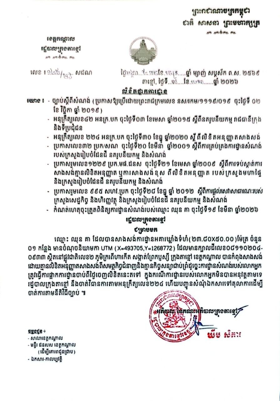 ពាក់ព័ន្ធករណីសំណង់អគារឃ្លាំងមួយ មានឈ្មោះ «ឈុន គា» កំពុងសាងសង់បំពានលិខិតផ្អាកការដ្ឋានខាងលើ មហាជនបានស្នើដល់ឯកឧត្ដម គួច ចំរើន អភិបាលខេត្តកណ្ដាលមេត្តាចាត់មន្ត្រីជំនាញចុះស្រាវជ្រាវ ស៊ើបអង្កេត និងមានវិធានការតឹងរ់ឹងចំពោះក្រុមអ្នកមិនគោរពច្បាប់ស្ដីពីសំណង់ផង៕