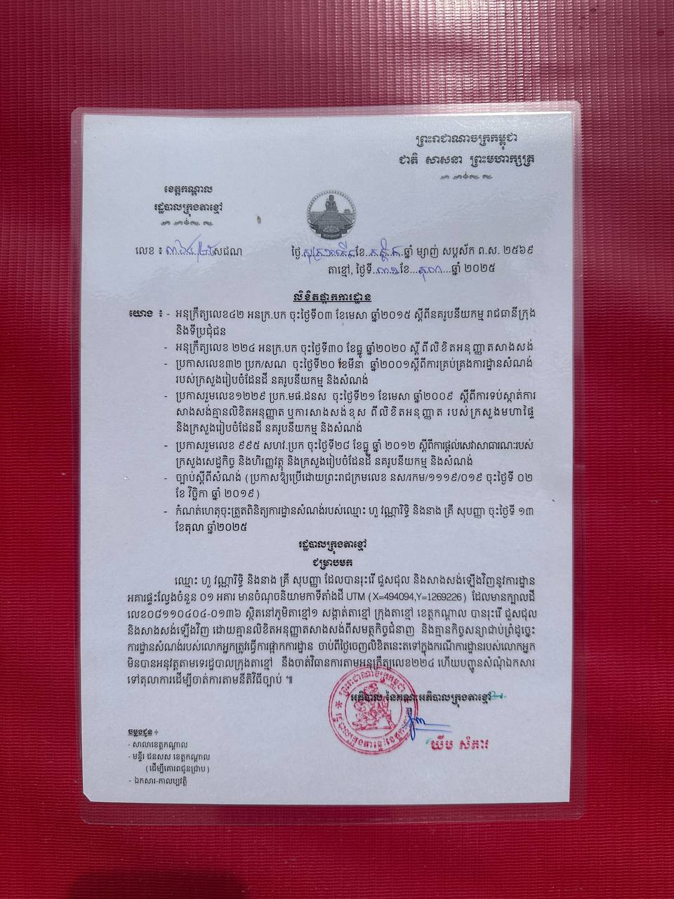 យោងតាមលិខិតផ្អាកការដ្ឋាន ចុះថ្ងៃទី៣១ ខែតុលា ឆ្នាំ២០២៥ រដ្ឋបាលក្រុងតាខ្មៅបានបញ្ជាក់ច្បាស់ថា ម្ចាស់សំណង់ឈ្មោះ ហួ វណ្ណារិទ្ធិ និងនាង គ្រី សុបញ្ញា បានអនុវត្តសកម្មភាពរុះរើ ជួសជុល និងសាងសង់ឡើងវិញដោយគ្មានលិខិតអនុញ្ញាតត្រឹមត្រូវ ព្រមទាំងគ្មានកិច្ចសន្យាជាប់ព្រំដី។ ទោះជាយ៉ាងណា ការអនុវត្តនៅលើទីតាំងជាក់ស្តែងបង្ហាញថា ការសាងសង់មិនត្រូវបានផ្អាកឡើយ។